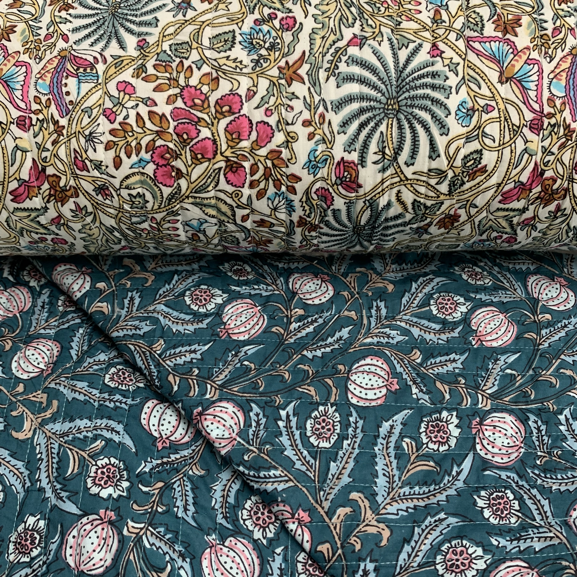 Indiase gewatteerde blokprintstof met twee verschillende kanten. Een mooie Indiase zeefdruk met 2 verschillende prints.