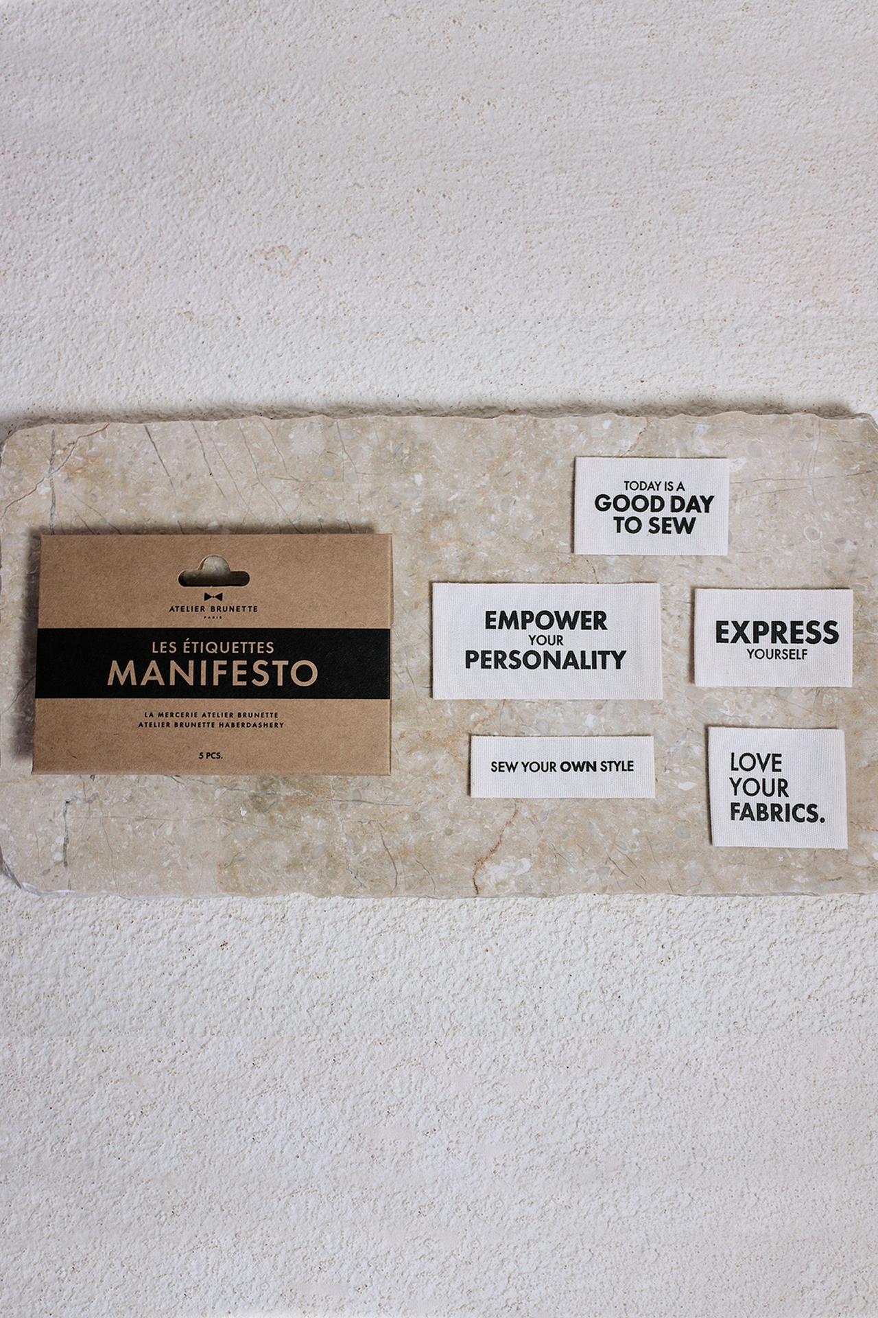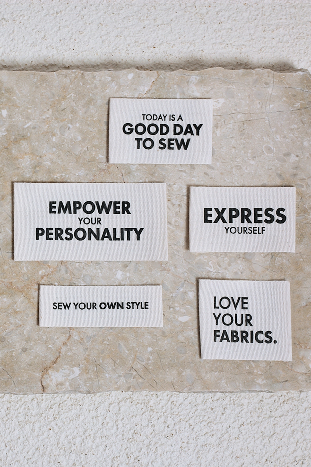 "Today is a good day to sew" L 50 mm X H 32 mm "Empower your personality" L 75 mm X H 38 mm "Express yourself" L 50 mm X H 32 mm "Sew your own style" L 60 mm X H 20 mm "Love your fabrics" L 43 mm X H 38 mm