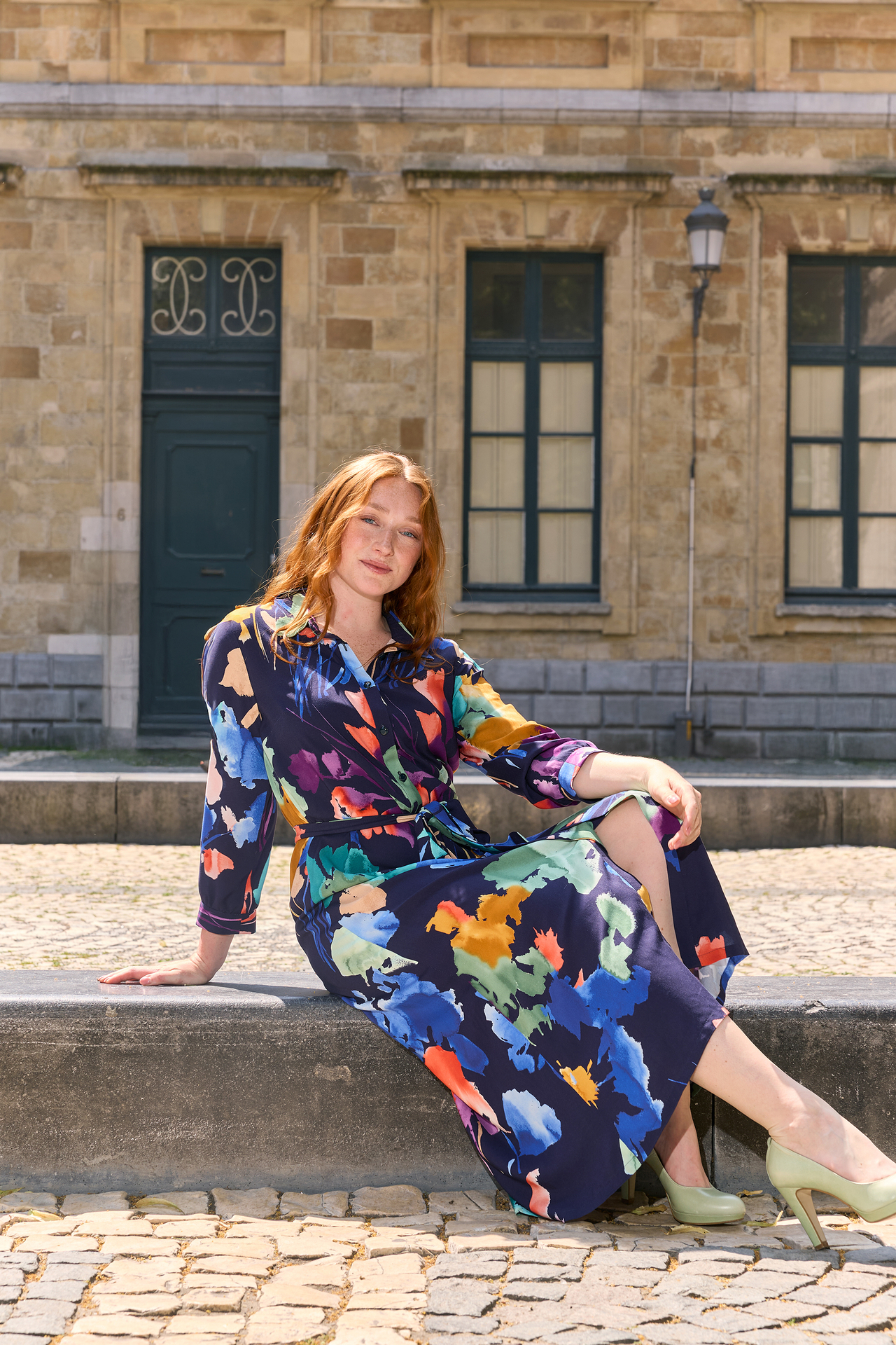 Een donkerblauwe viscose met wazige, kleurige bloemenprint. Deze stof is geschikt voor blouses, jurken, rokken,...Â
