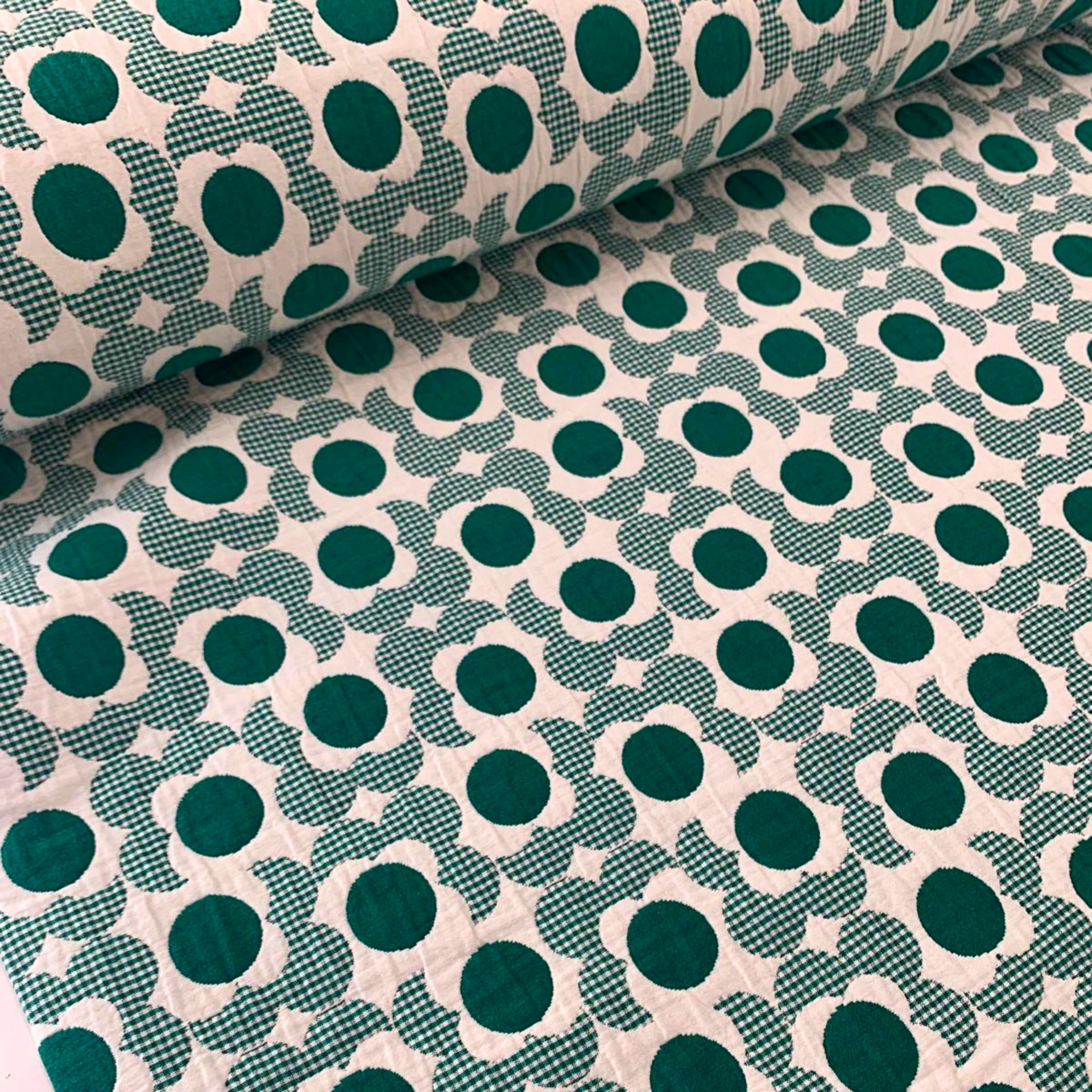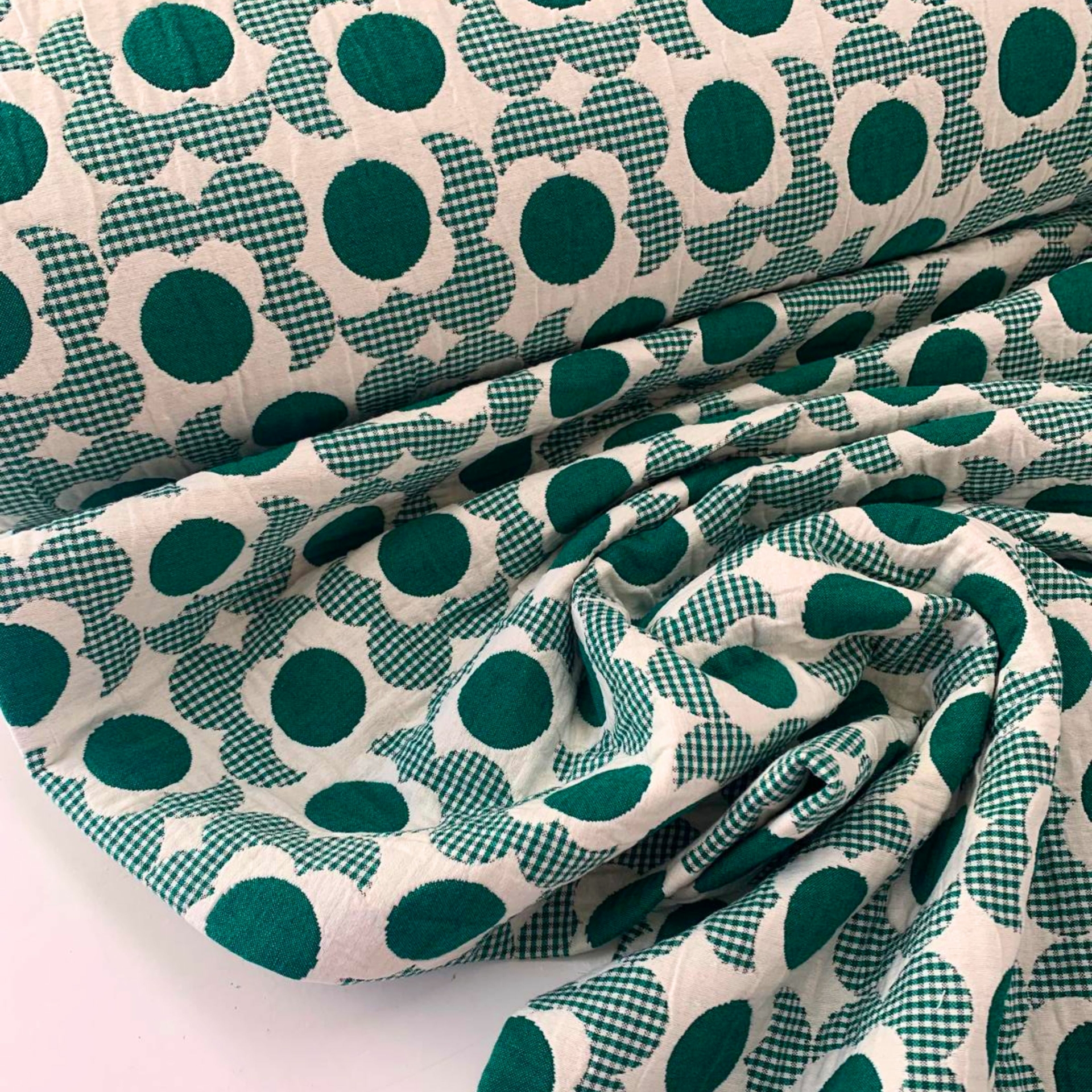 Een prachtige jacquardstof met een groen/crème kleurig bloemenmotief