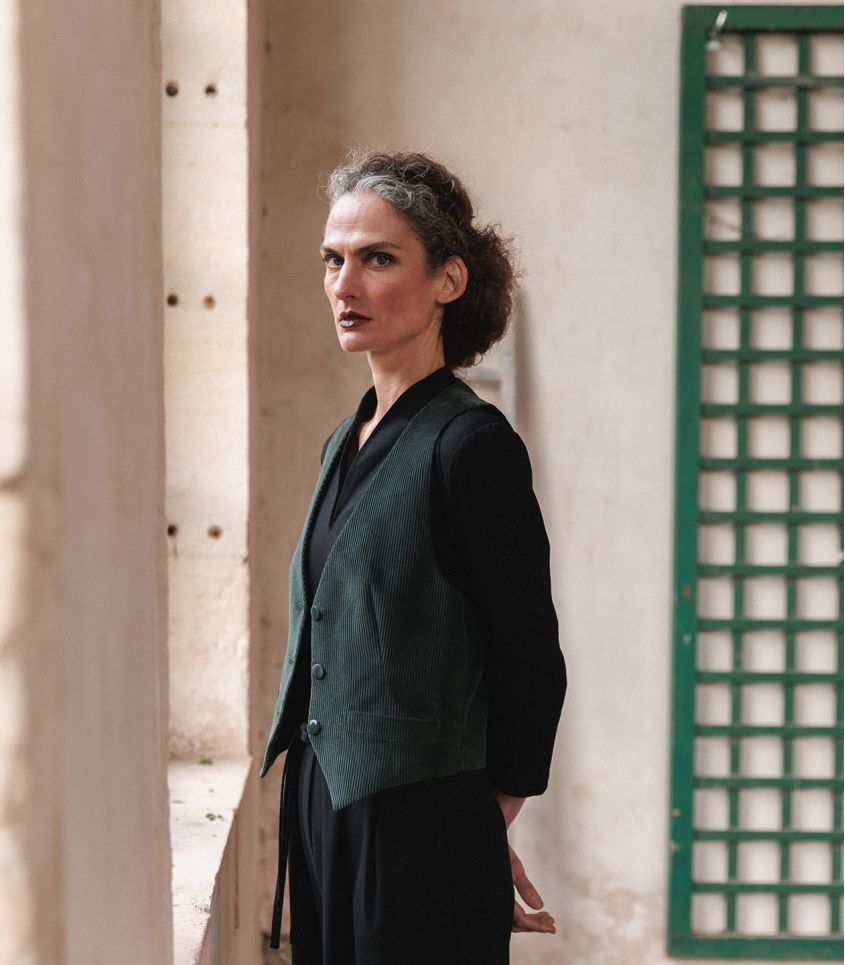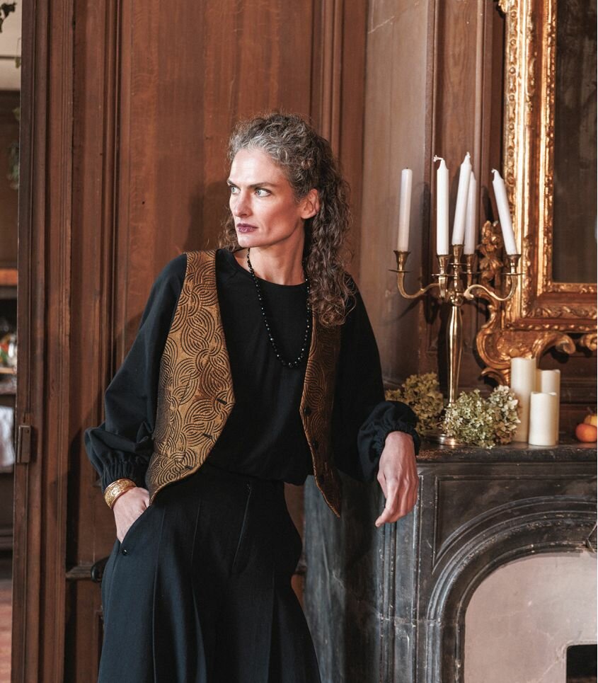 MOUCHETTE is een gilet, mouwloos en kort. Dit iconische stuk uit de herengarderobe wordt gedragen over een blouse of een luchtige jurk of met een geplooide broek voor een uitgesproken boyish look.