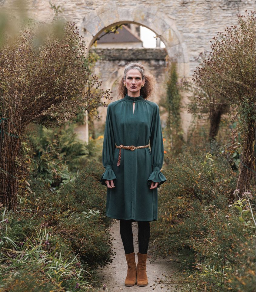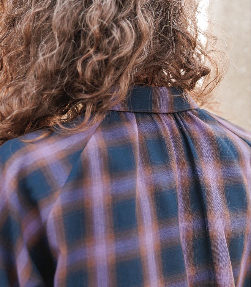 VIOLETTE is een blouse of jurk met verfijnde charme, herkenbaar aan de raglanmouwen en de delicate plooien die de halslijn benadrukken, zowel aan de voor- als achterkant.
