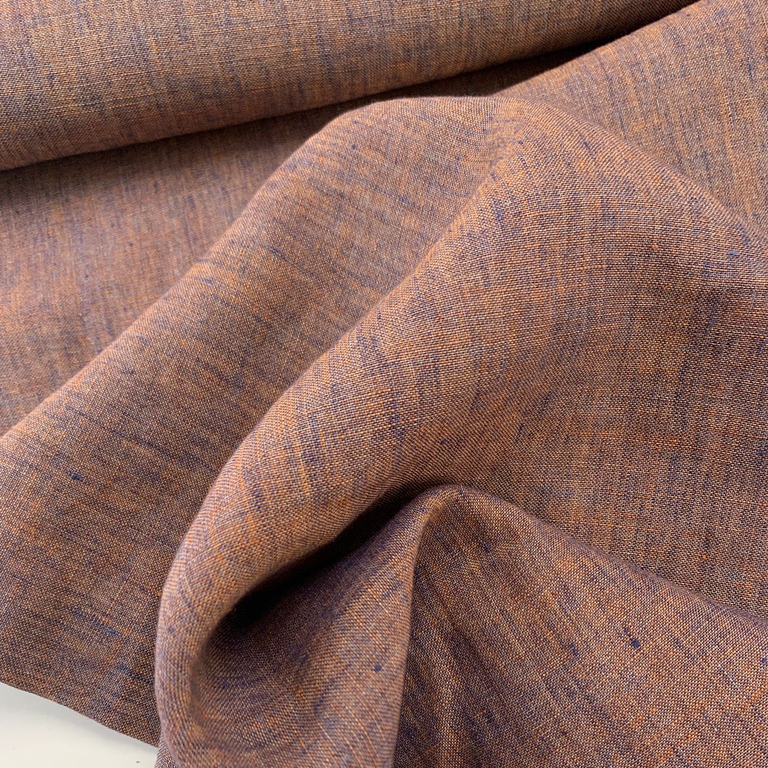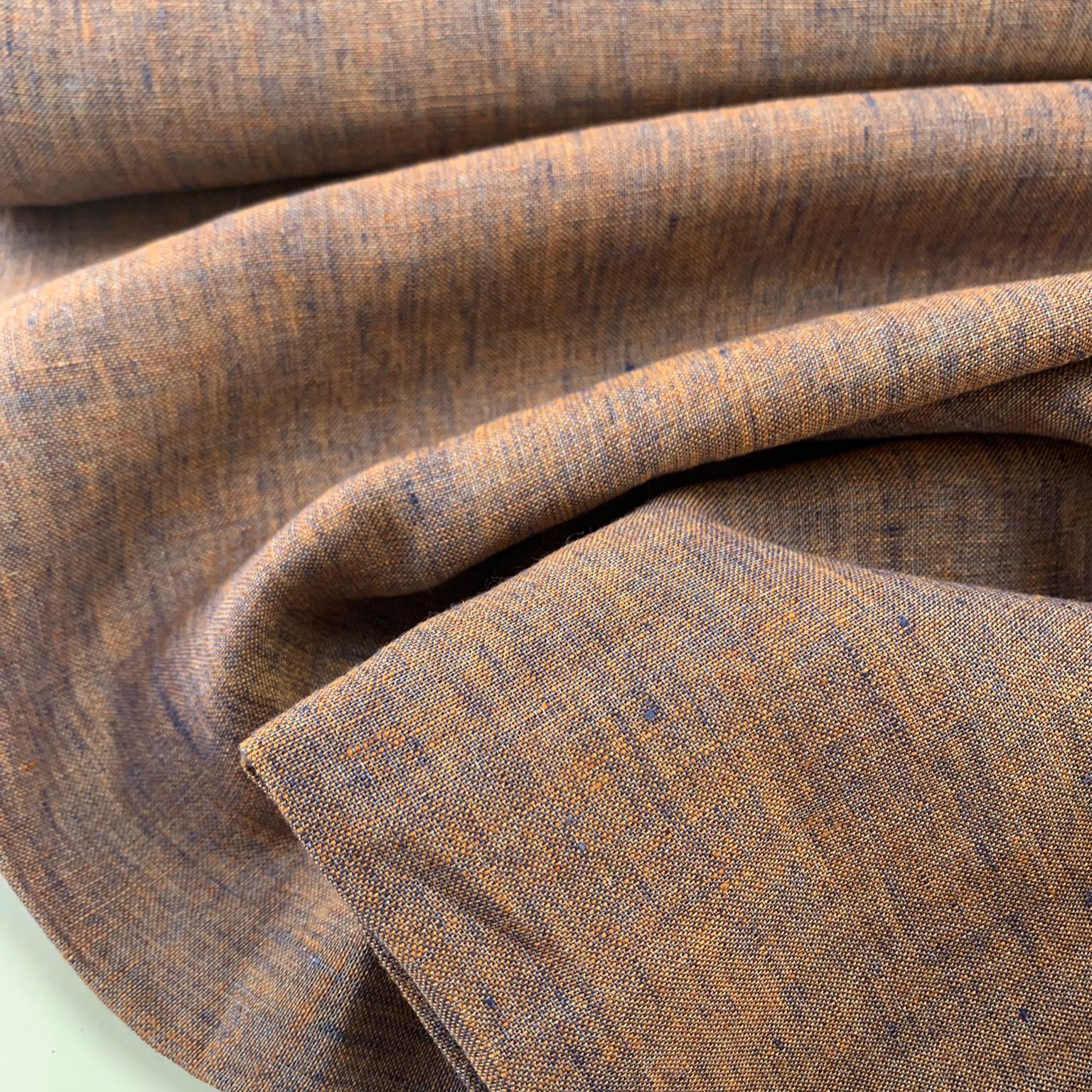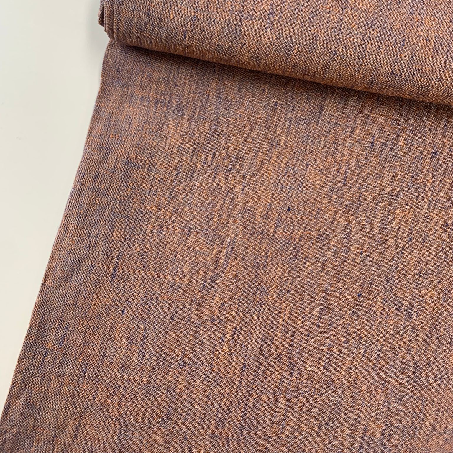 Prachtige geweven linnen in een mooie gemêleerde blauw/oranje kleur.