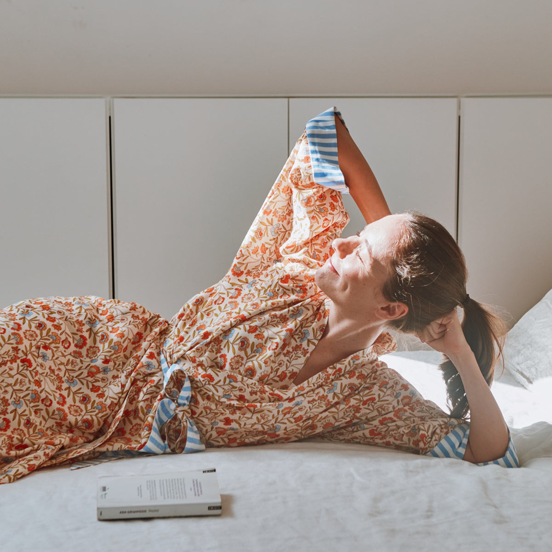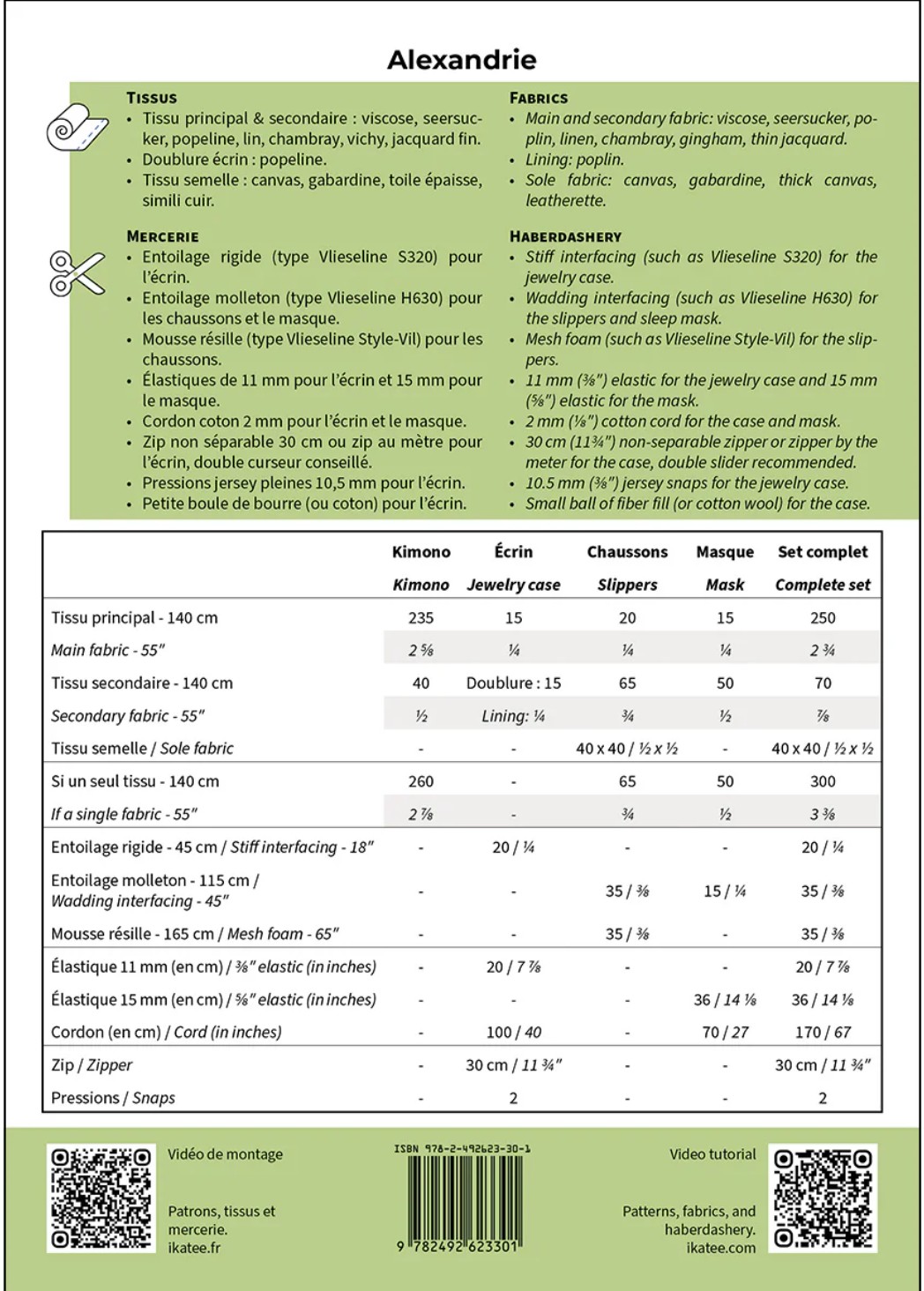 Alexandrie is a set of four patterns designed around the bedroom, for women and men: a kimono, slippers, a sleep mask and a jewelry box. The finishes are meticulous (French seams, flat felled seams, trimmed, and piped) for a refined result.