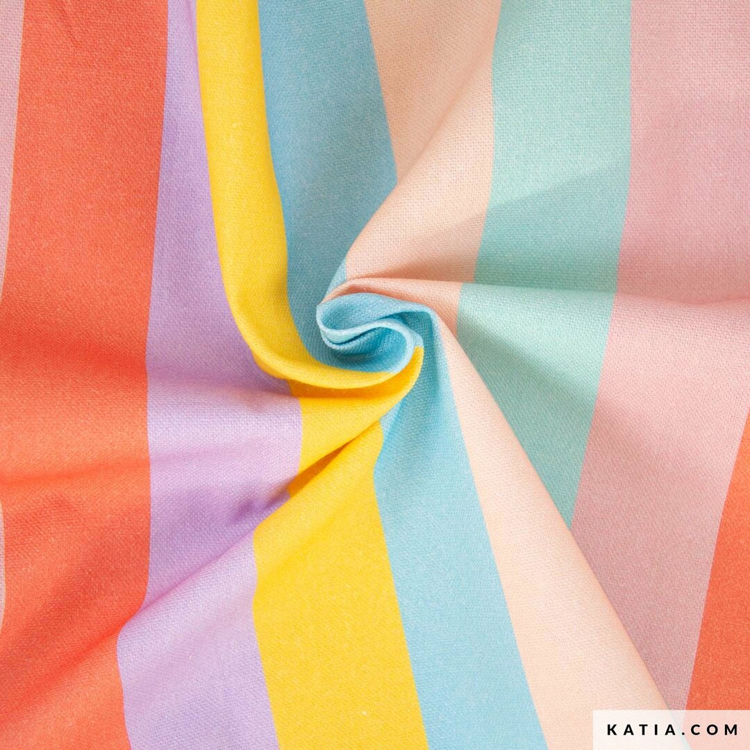 De Canvas Cotton 8oz Print Pastel Stripes van Katia Fabrics is een fijne canvas van 100% katoen met een opvallende print van verticale strepen in pastel- en felle kleuren: koraal, lila, geel, hemelsblauw, roze en mintgroen. Een ontwerp vol positieve energie dat een speelse en zoete touch geeft aan elk naaiproject. Met een gewicht van 8oz is de stof stevig maar makkelijk te verwerken – perfect voor schoolrugzakken, totebags, toilettassen, kussenhoezen, decoratieve vlaggetjes en andere zelfgemaakte accessoires. De ideale keuze voor wie functionaliteit en design wil combineren in een frisse en kleurrijke stijl. Combineer met andere effen of bedrukte canvasstoffen uit de Katia Fabrics-catalogus voor unieke creaties vol persoonlijkheid.