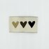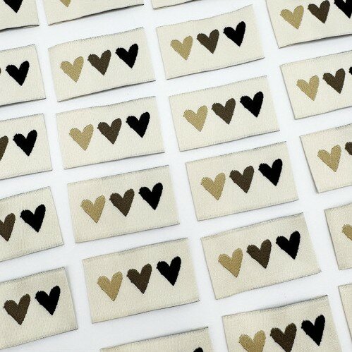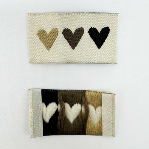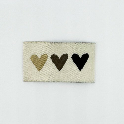 Ecru gekleurde geweven labels met 3 bruine harten om op kleding te naaien. Ze rafelen niet en geven een finishing touch om creaties af te maken of een kledingstuk te personaliseren. Ze kunnen ook een scheur of vlek verbergen! AFMETINGEN: 45 x 25 mm Material: 100% polyester Do not iron.