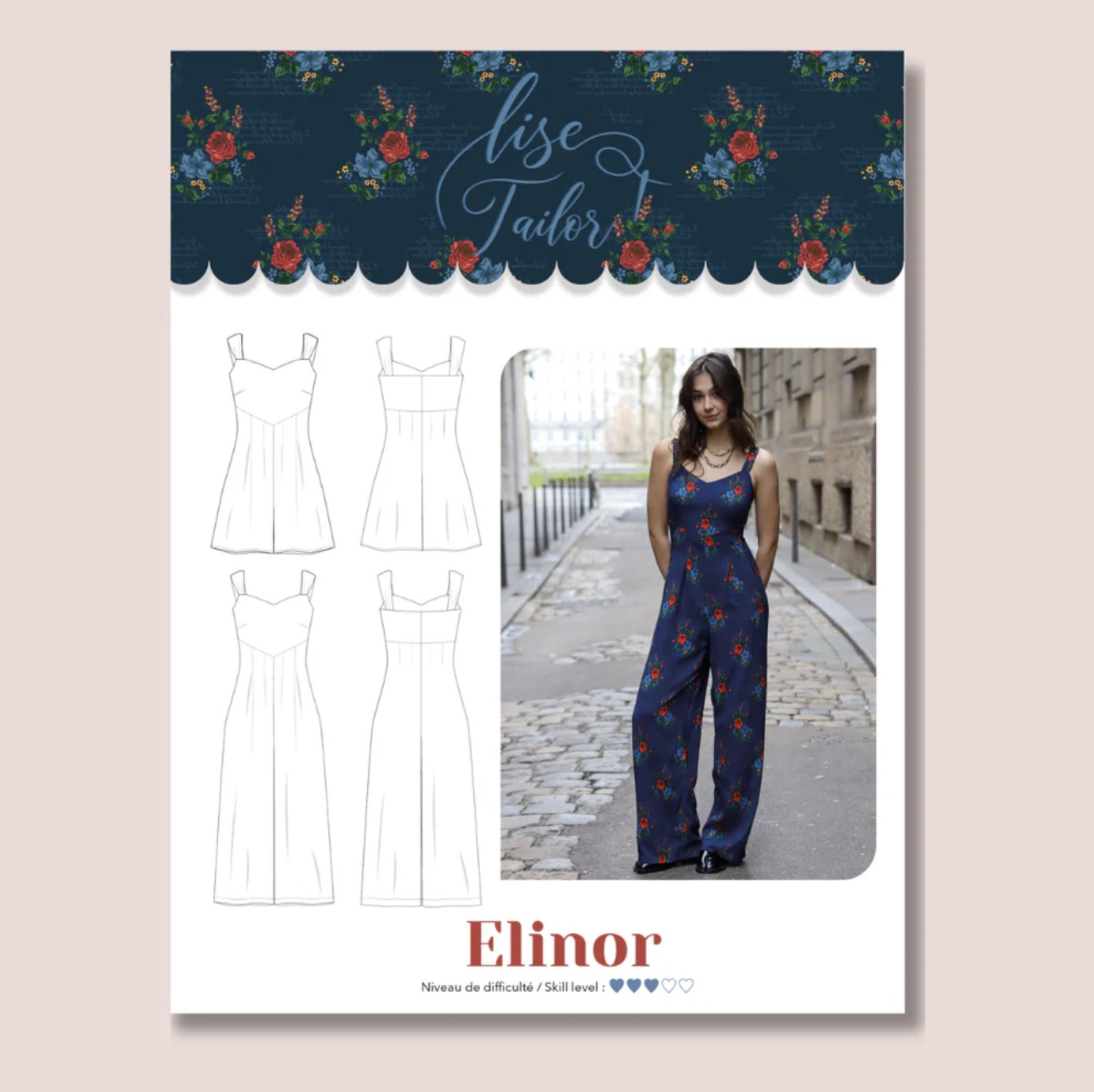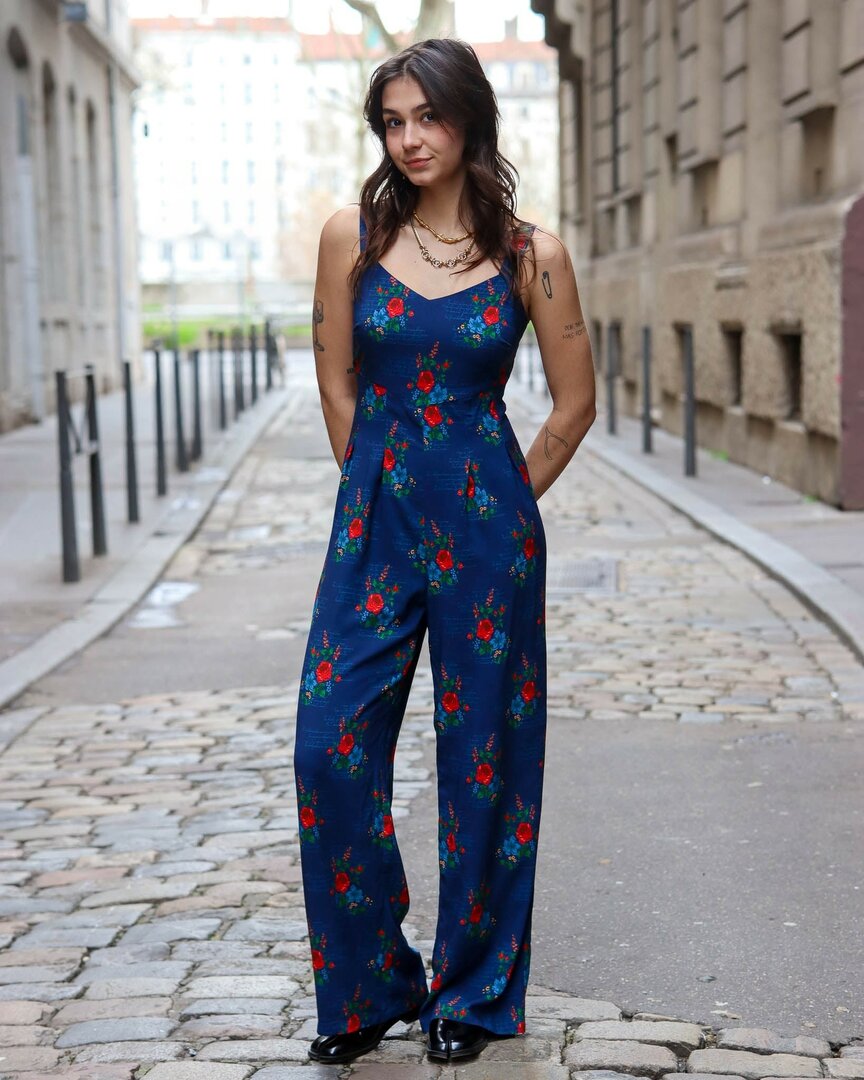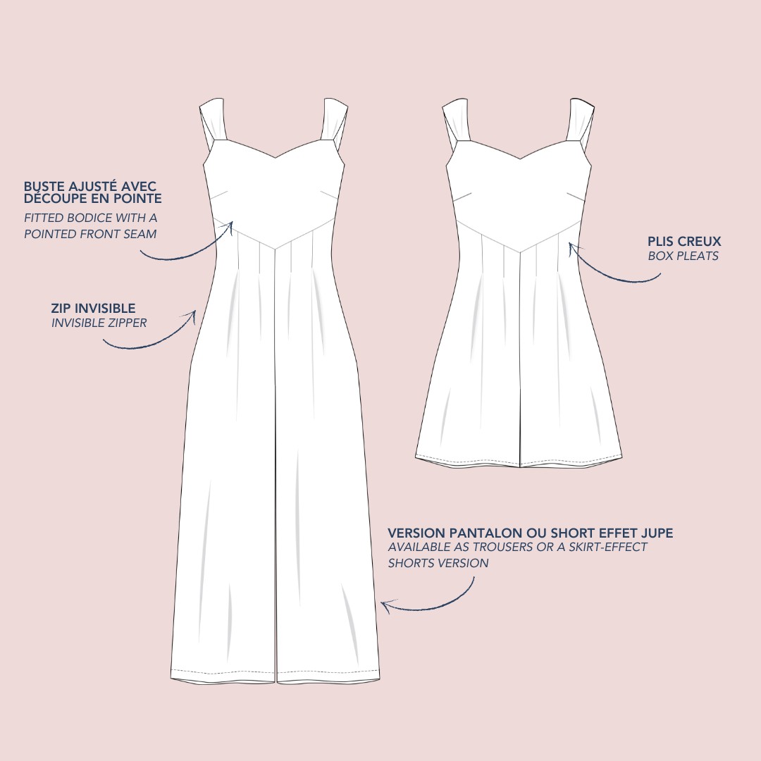 Verkrijgbaar als broek of als rokbroek, is Elinor een jumpsuit die speelt met volumes. Details: – Aansluitend lijfje – Puntige uitsnijding aan de voorkant en een rechte lijn aan de achterkant – De taille wordt geaccentueerd door omgekeerde plooien aan de voorkant die de breedte van de benen definiëren – Figuurnaden geven structuur aan de achterkant, die sluit met een onzichtbare rits Gevorderd niveau