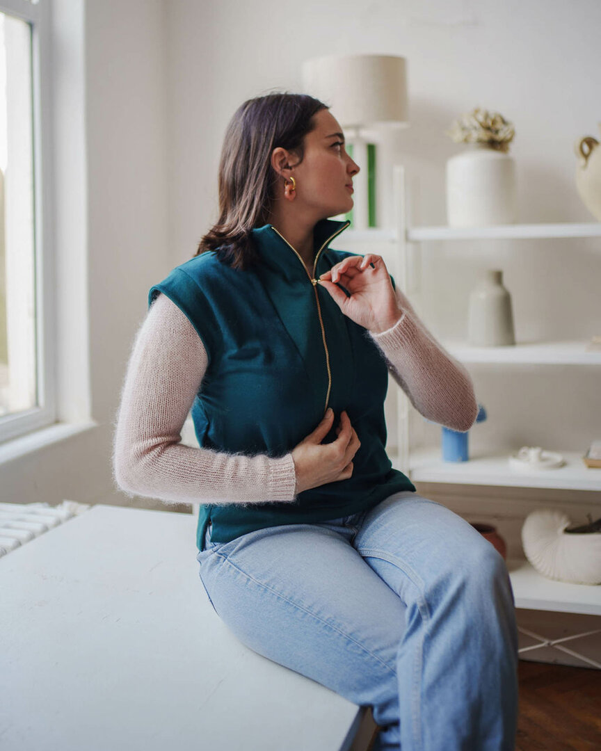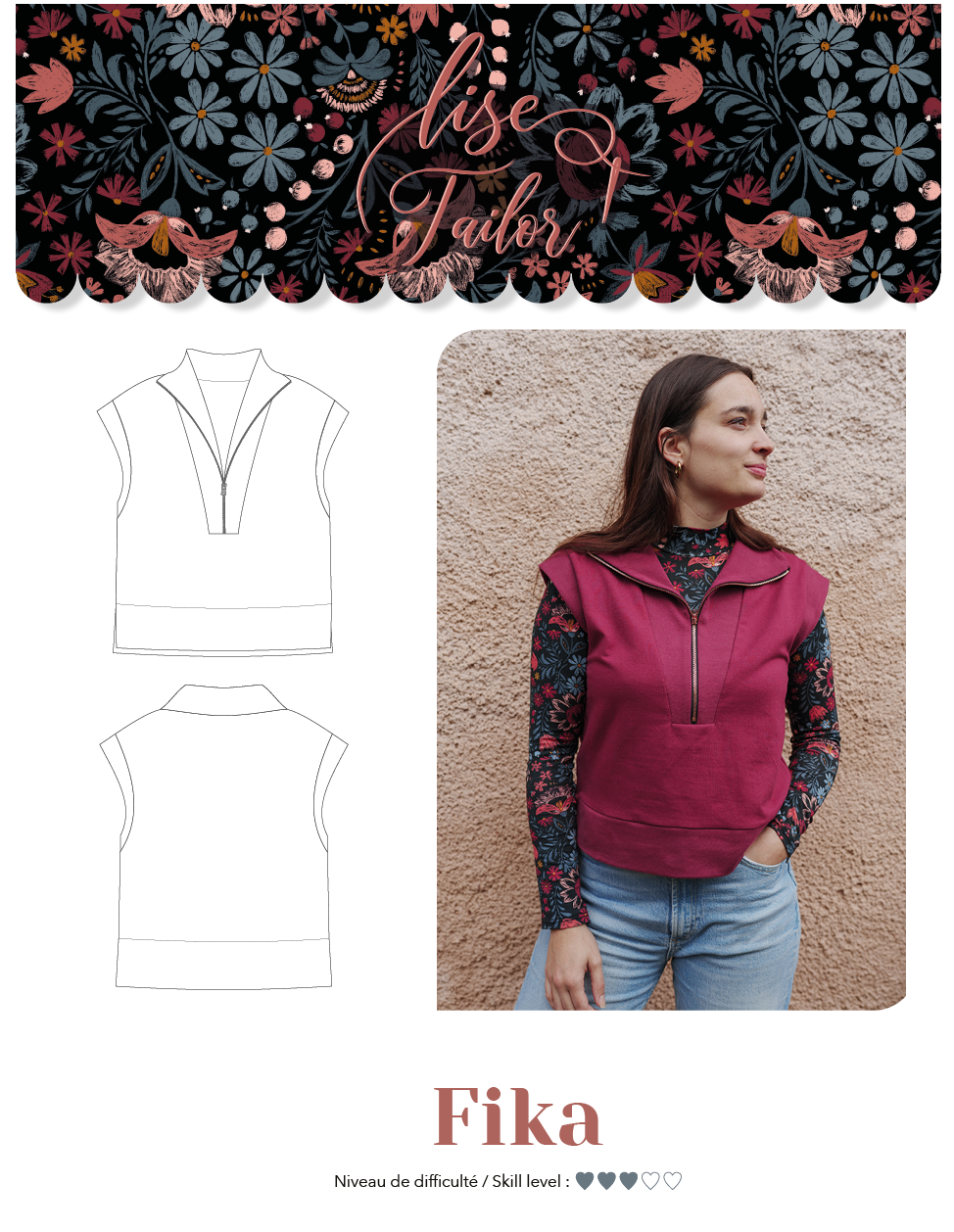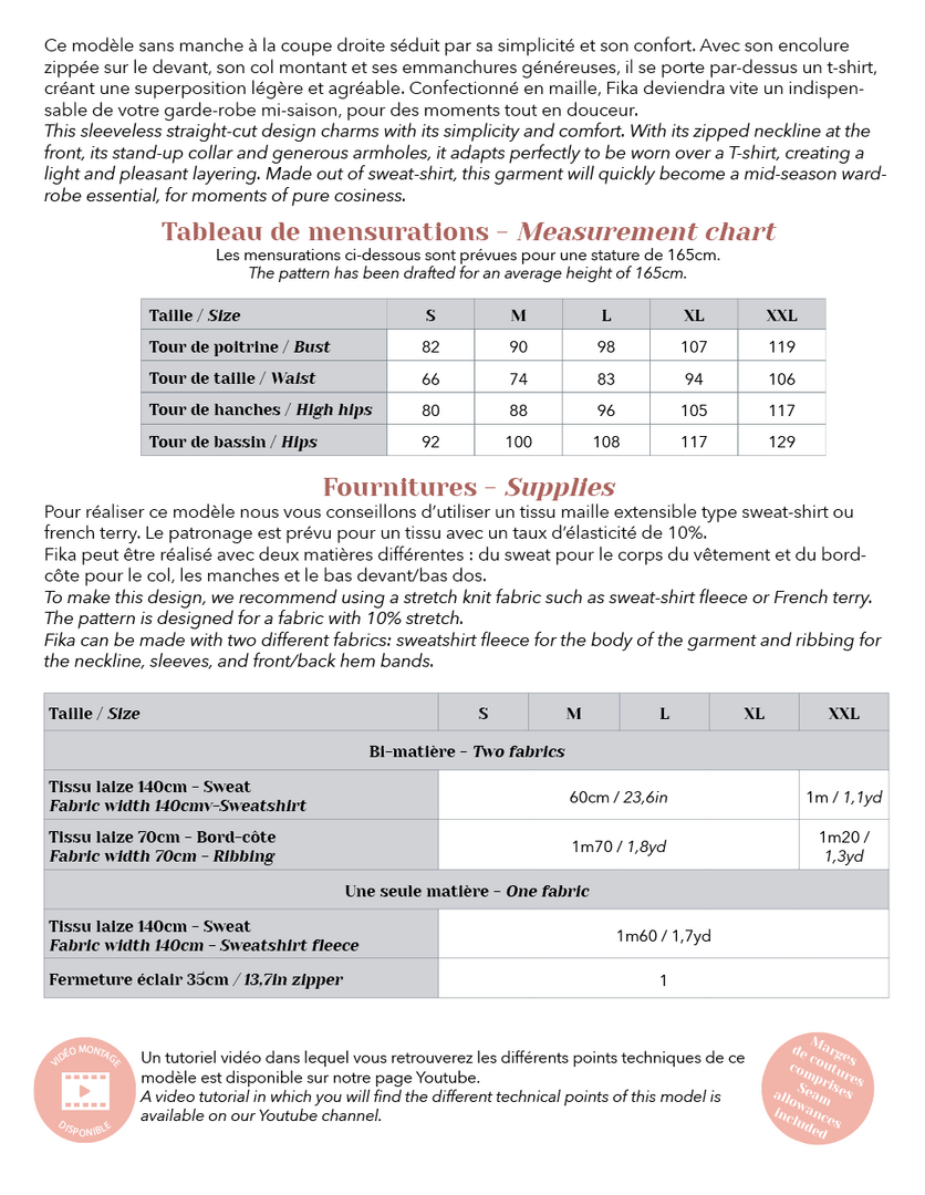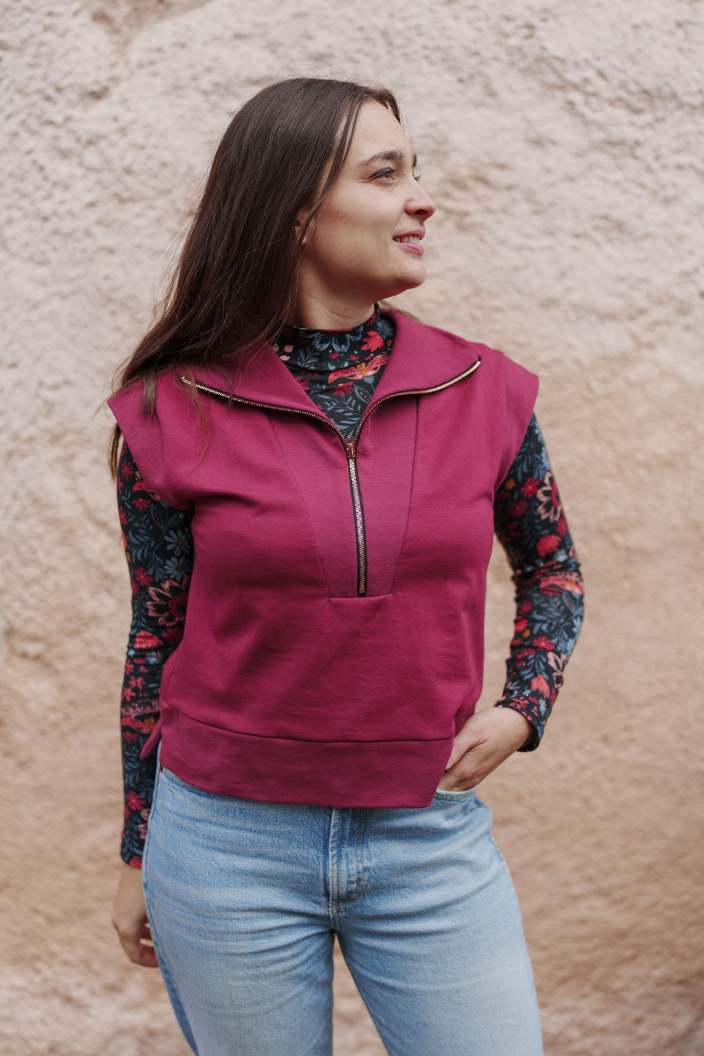 Dit mouwloze, rechte model charmeert door zijn eenvoud en comfort. Met zijn rits aan de voorkant, opstaande kraag en royale armsgaten is hij perfect te dragen over een T-shirt, voor een lichte en aangename laagjeslook. Gemaakt van sweatshirtstof, wordt dit kledingstuk al snel een onmisbaar kledingstuk voor het tussenseizoen, voor momenten van pure behaaglijkheid. Het patroon bevat: - Stap-voor-stap uitleg in het Frans en Engels - Het patroon op ware grote van maat 34 tot 52 - En dit alles in een schattige verpakking zoals we gewend zijn van Lise Tailor