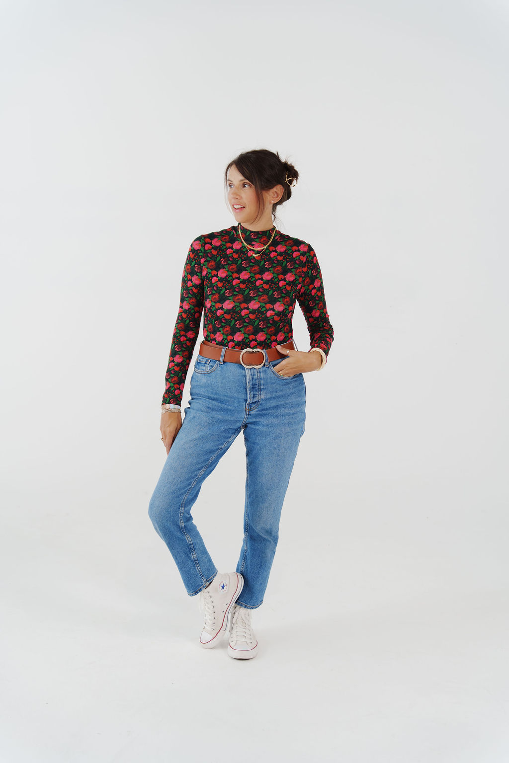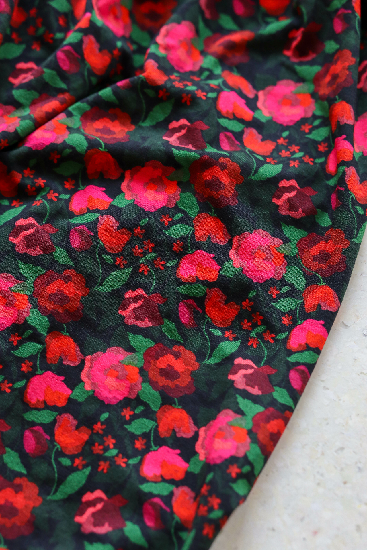 Bloemen in tinten rood en fuchsia vervlechten zich op een nachtblauwe achtergrond, in een fijner en compacter dessin dat de soepelheid van een zachte, vloeiende jersey extra benadrukt.