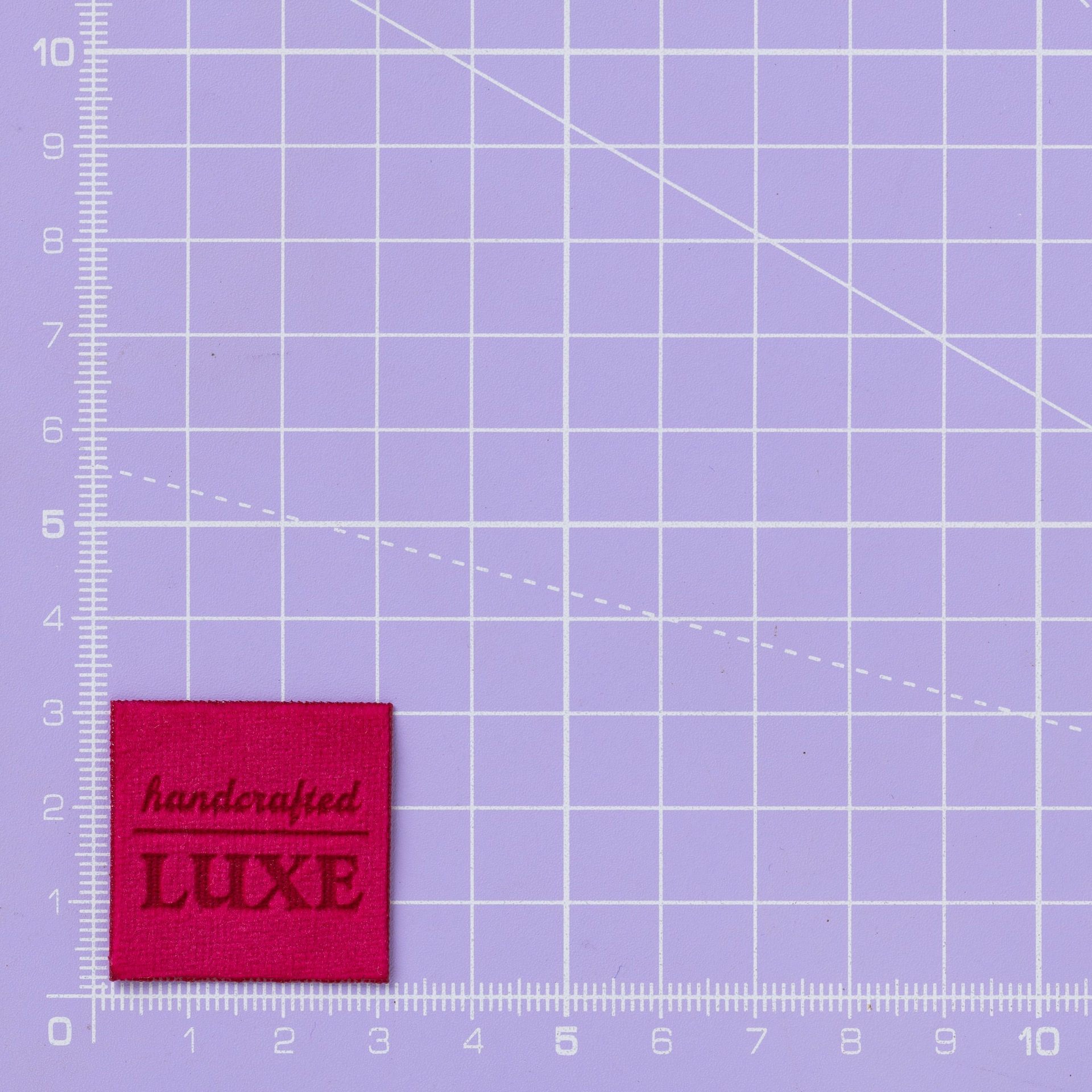 Ontdek pure luxe met ons rijke, diep fuchsiaroze fluwelen naailabel, lasergegraveerd met de tekst HANDCRAFTED LUXE.