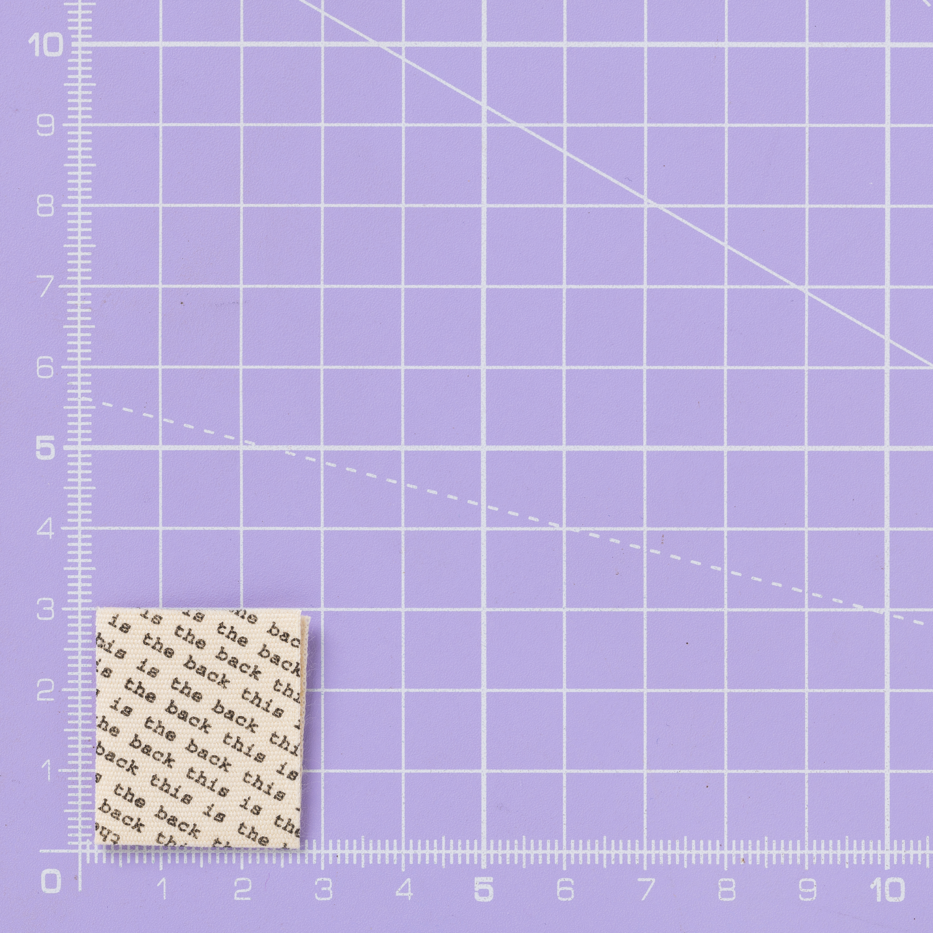 Met klassieke zwarte typemachineletters op een zachte crèmekleurige achtergrond heeft dit geweven label een herhaald “this is the back”-motief – alsof het zo uit een vintage krant is gezet.