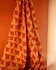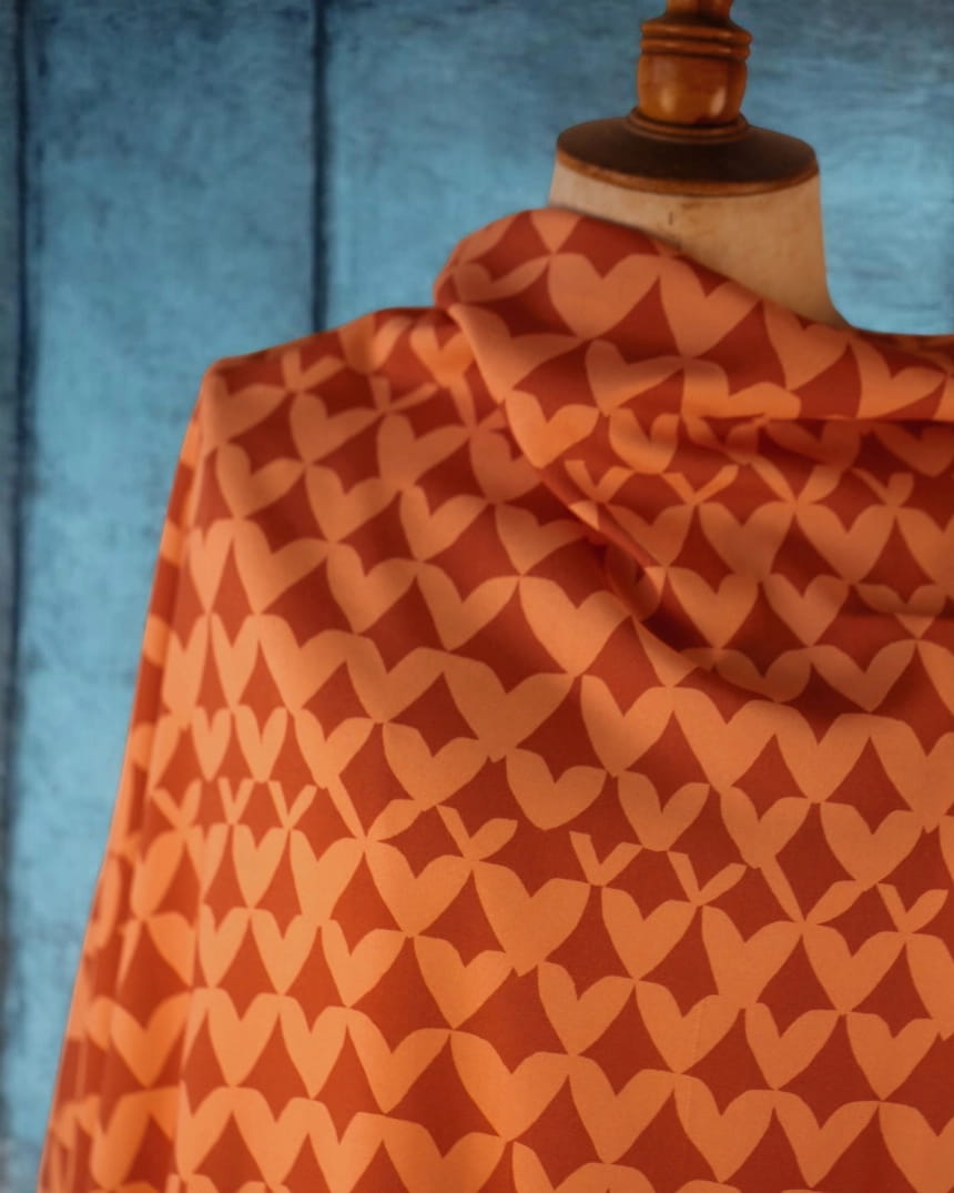 Het contrast tussen diep terracotta en fris perzik geeft de stof meteen warmte en levendigheid. De vormen zijn strak en duidelijk, zonder overbodige details. Het patroon doet denken aan de seventies, maar voelt tegelijk modern en eigentijds aan.