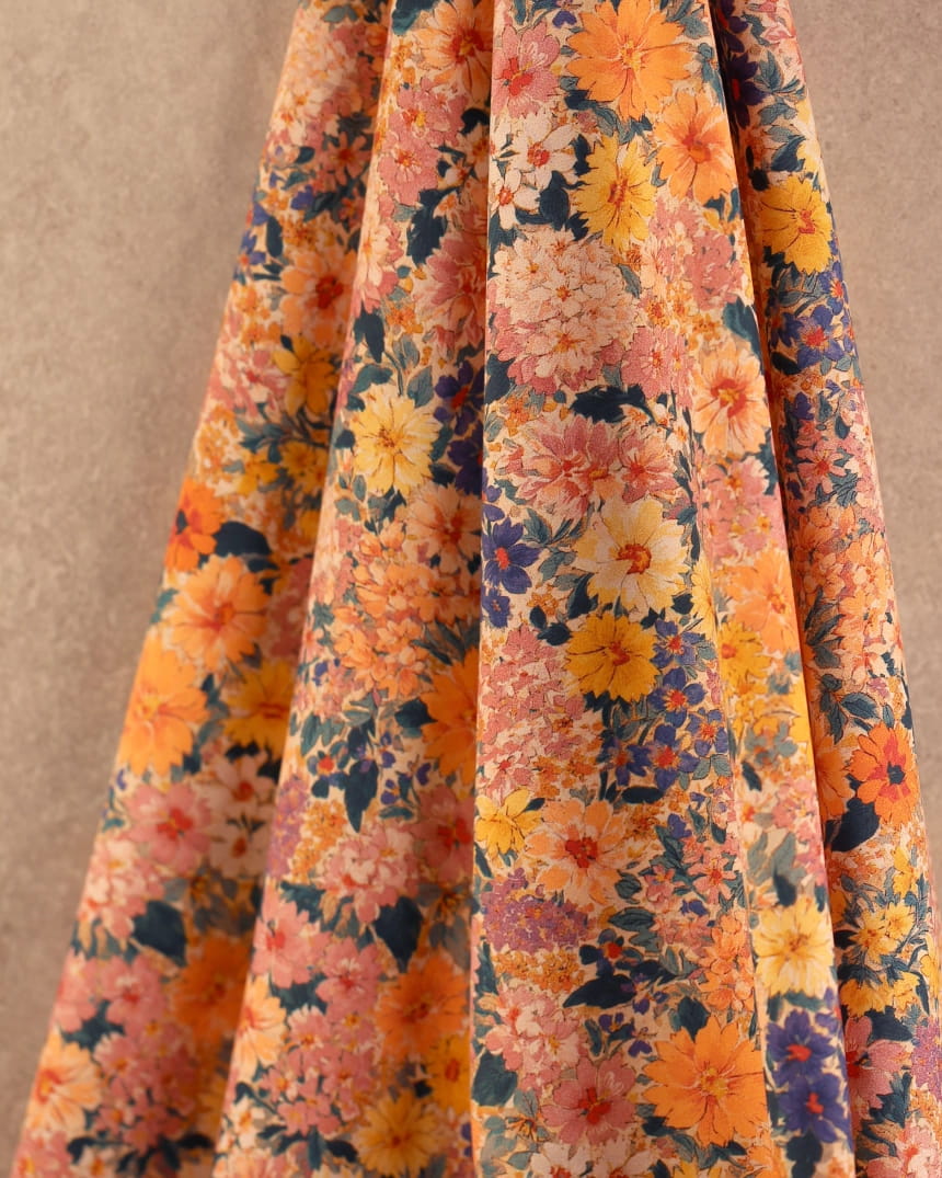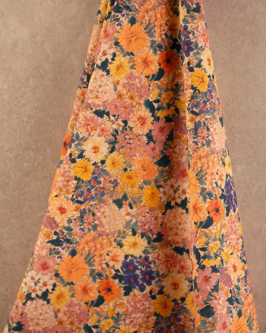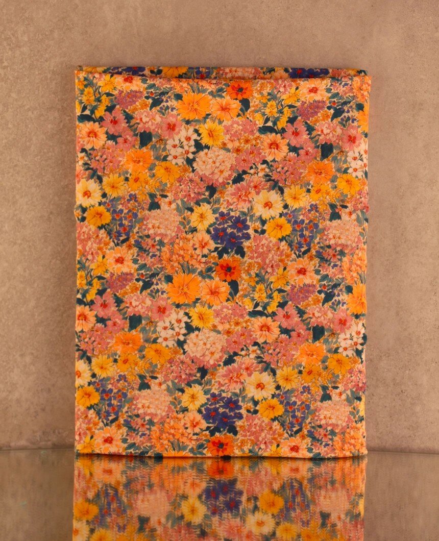 Je herkent sprankelende dahlia’s, fijne veldbloemetjes en zachte bloemblaadjes die elkaar kruisen en versterken. Warme tinten als oranje, koraal, poederroze en saffraangeel worden prachtig aangevuld met accenten van diepblauw en grijsgroen.