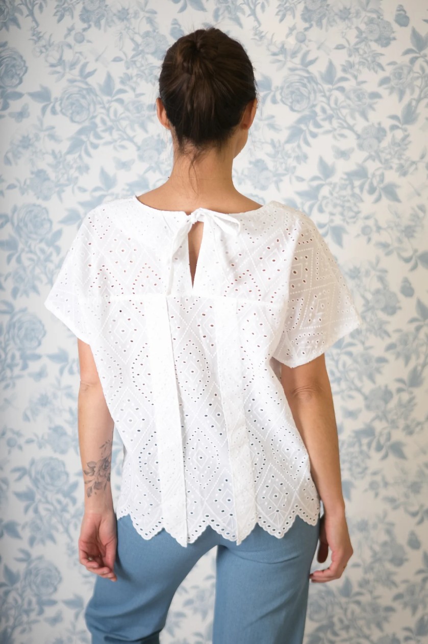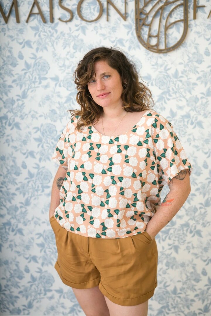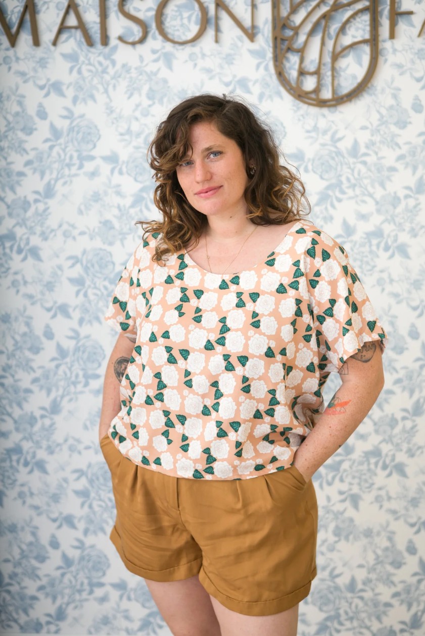 PALMA is the beginner's sewing pattern for your summer wardrobe! Simple, with the Maison Fauve touch: the pretty pleated back with yoke, closed by pretty knotted ties. Its loose fit and open neckline make it ultra comfortable, as beautiful worn as a blouse as tucked into pants.