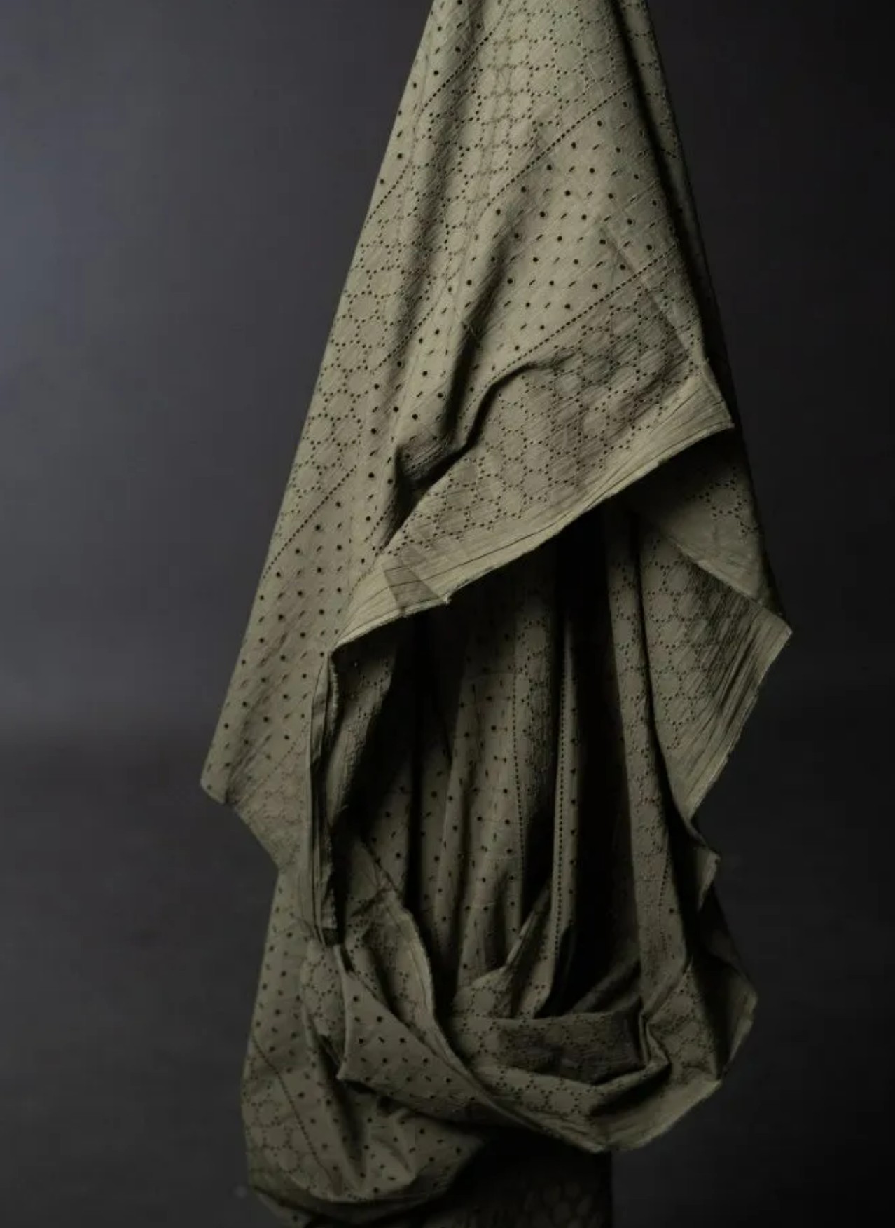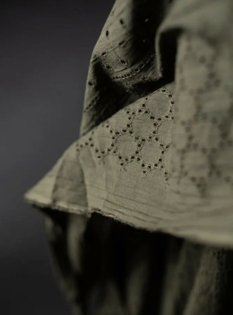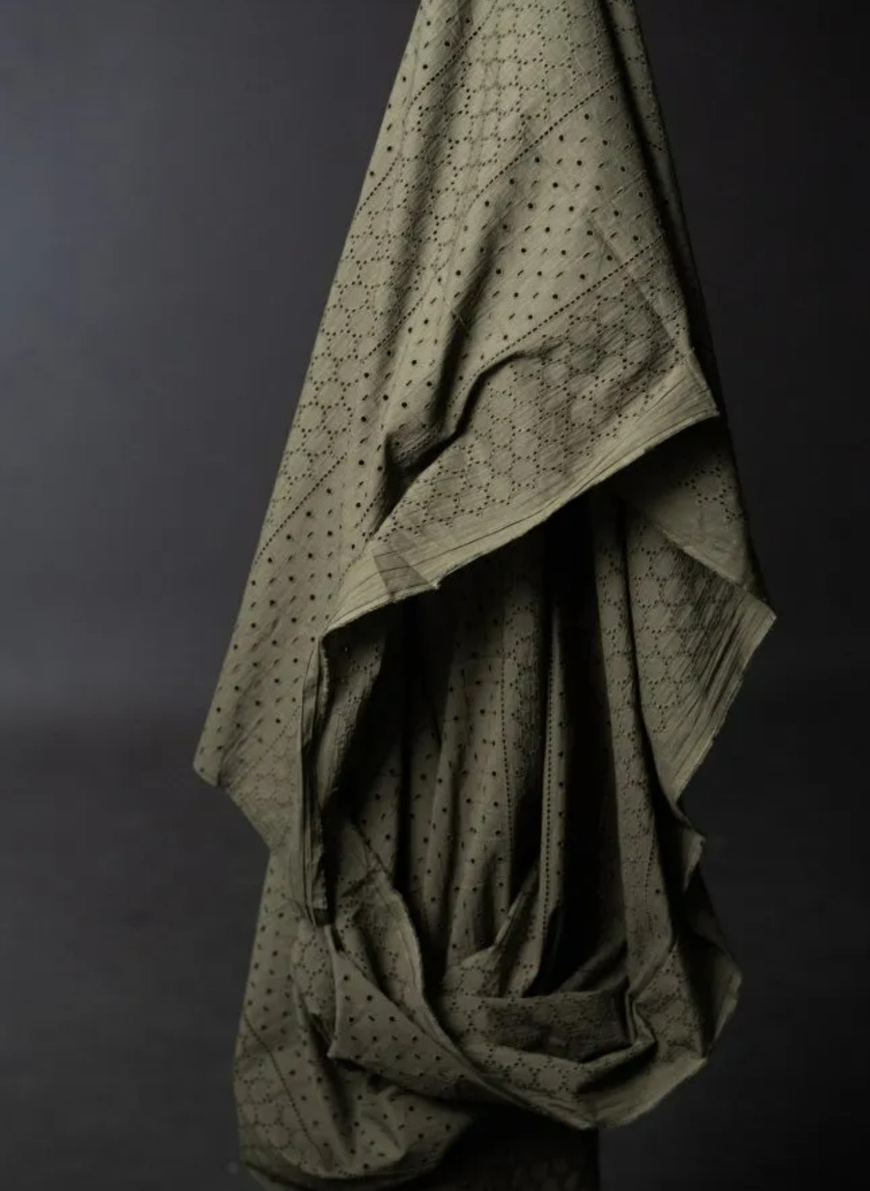 Een olijfgroene broderie anglaise met een herhalend patroon om de 14 cm.