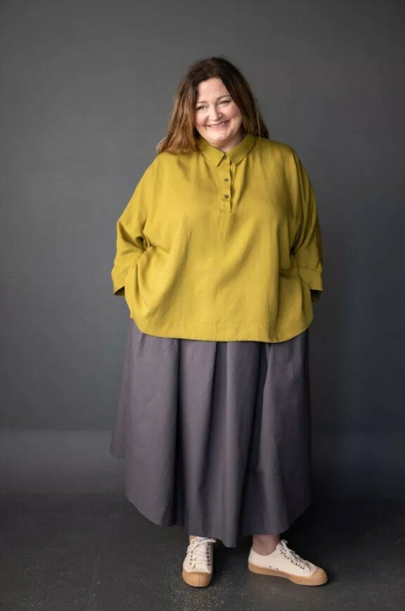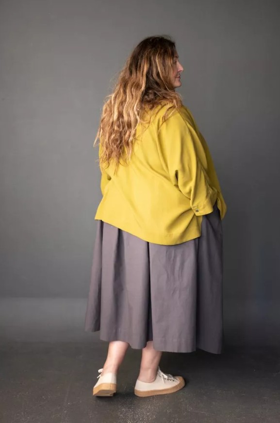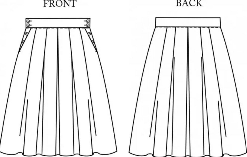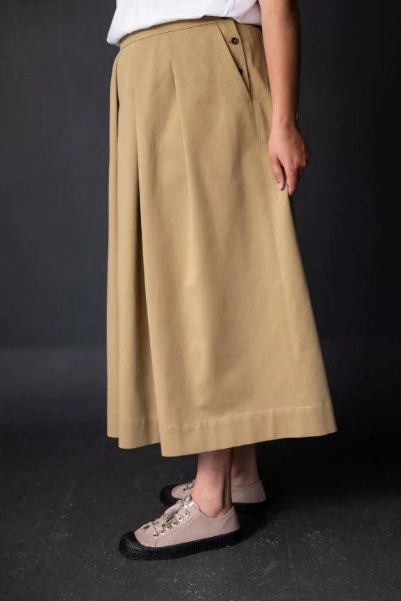 A pleated A-line skirt with slanted pockets, side button fastenings and pleats for fullness. Soft and floaty in linen, or smart and hardy in cotton twill. Can be made lined or unlined.