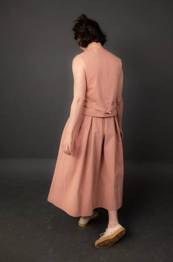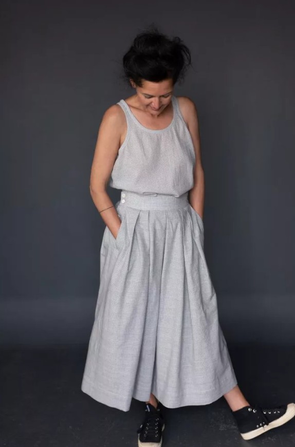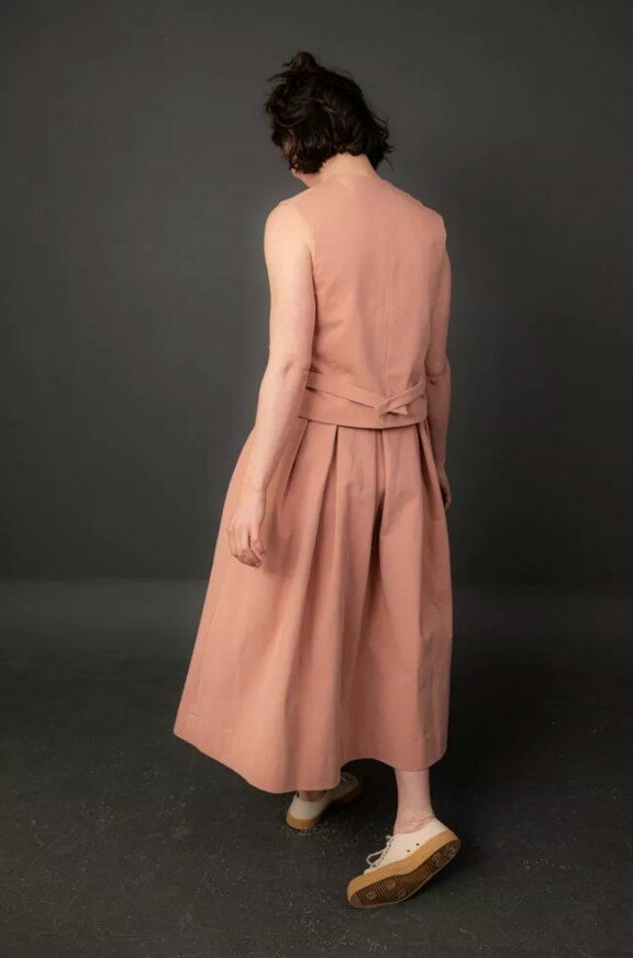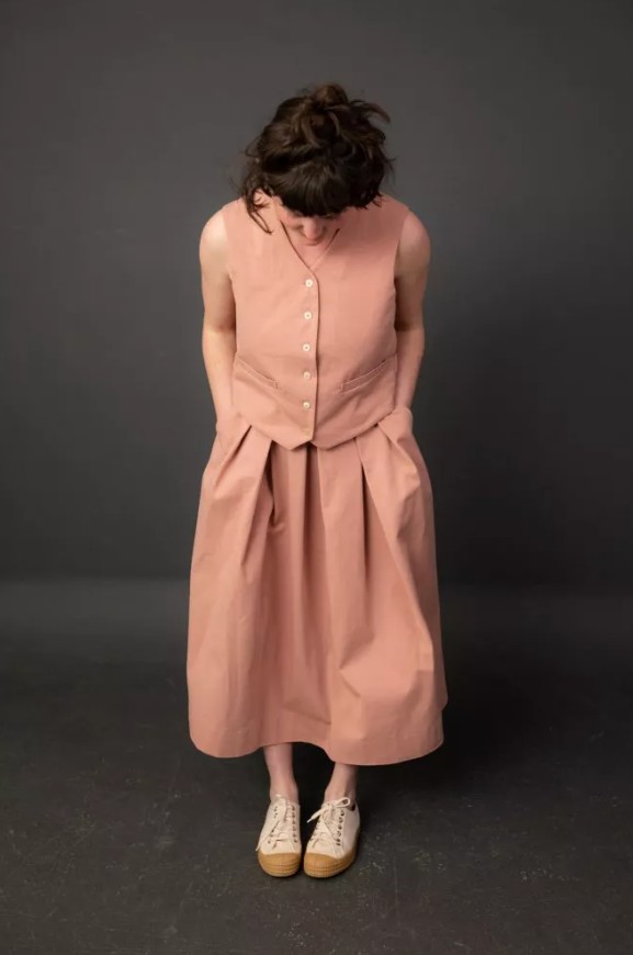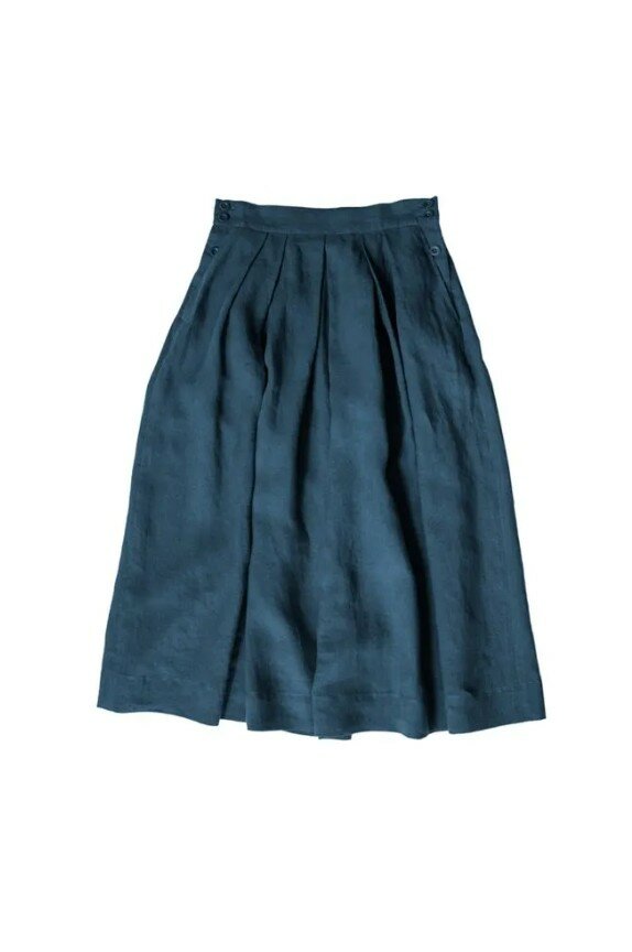 A pleated A-line skirt with slanted pockets, side button fastenings and pleats for fullness. Soft and floaty in linen, or smart and hardy in cotton twill. Can be made lined or unlined.