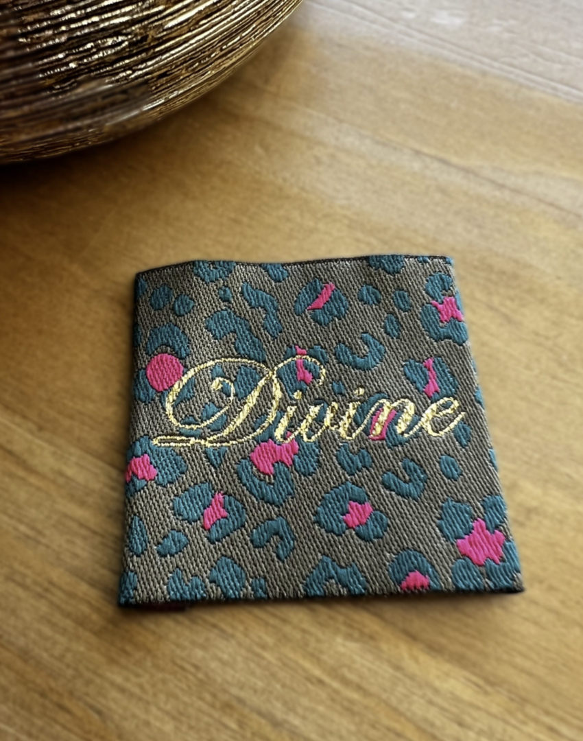 Het Divine Léopard Kaki-label, geweven in Frankrijk, brengt een elegante en trendy finishing touch aan je handgemaakte kleding en accessoires. Het label heeft een formaat van 4 x 4 cm met 6 mm omgevouwen randen. Beide uiteinden zijn voorgevouwen, waardoor het eenvoudig in te naaien is, een nette afwerking biedt en rafelen voorkomt.