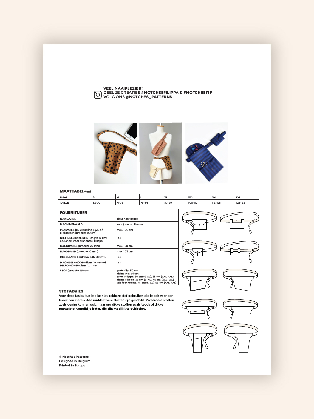 Dit patroon bundelt twee veelzijdige tasjes — Filippa en Pip — tot een eigentijdse en praktische set die perfect inspeelt op de trend van utility fashion.