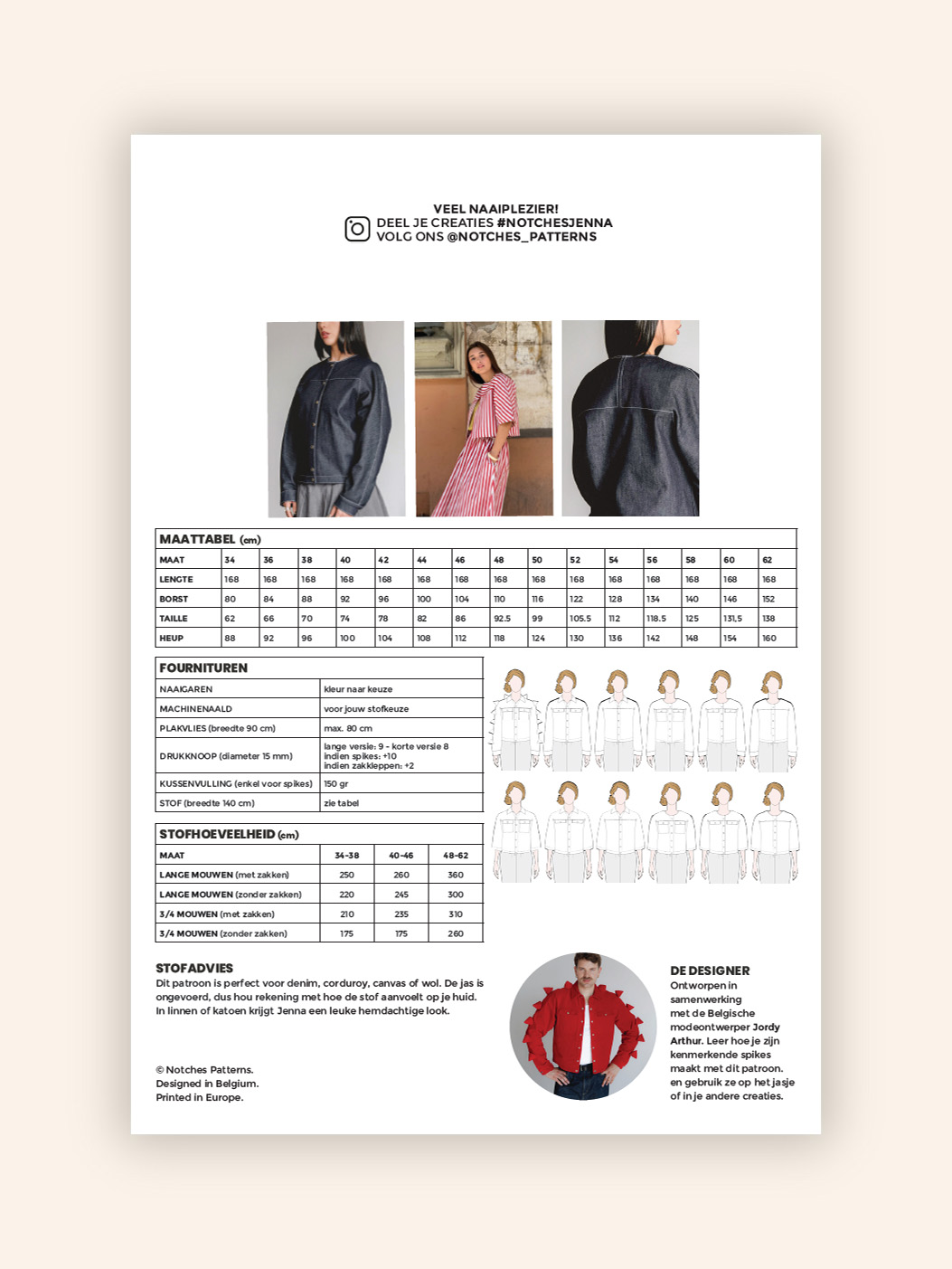 De Jenna jacket is een veelzijdig naaipatroon voor een jas die gemaakt is in samenwerking met de Belgische modeontwerper Jordy Arthur. Met dit patroon haal je zijn kenmerkende stijl rechtstreeks naar je naaitafel.