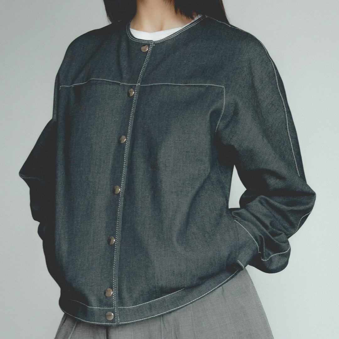 Dit zelfmaakjasje is ongevoerd en springt in het oog door zijn raglanmouw die overloopt in het plat stuk met een opvallende geïncrusteerde hoek als resultaat. Een tweede schoudernaad zorgt niet alleen voor extra vorm, maar is ook dé perfecte plek om de verwijderbare spikes te bevestigen als je een echte statement look wil creëren.