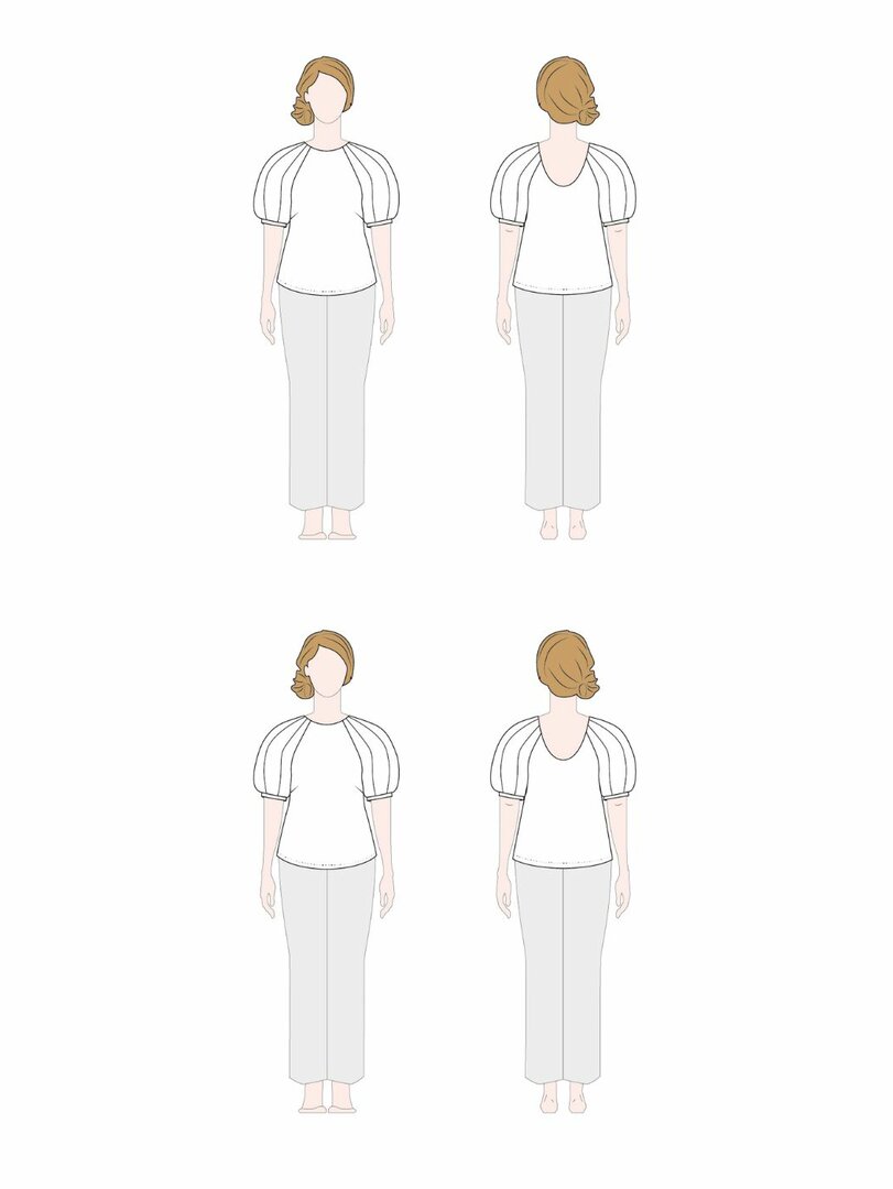 Odell is een speelse maar beginnersvriendelijke top of korte jurk met de gemakkelijkste pofmouwen die je ooit zult naaien—geen rimpels nodig, alleen slim gevormde naden. Met een hoge ronde hals vooraan en een diepe uitsnijding achteraan is ze ontworpen om de show te stelen. Snel te naaien, gemakkelijk te dragen en perfect om stoffen te mixen!