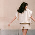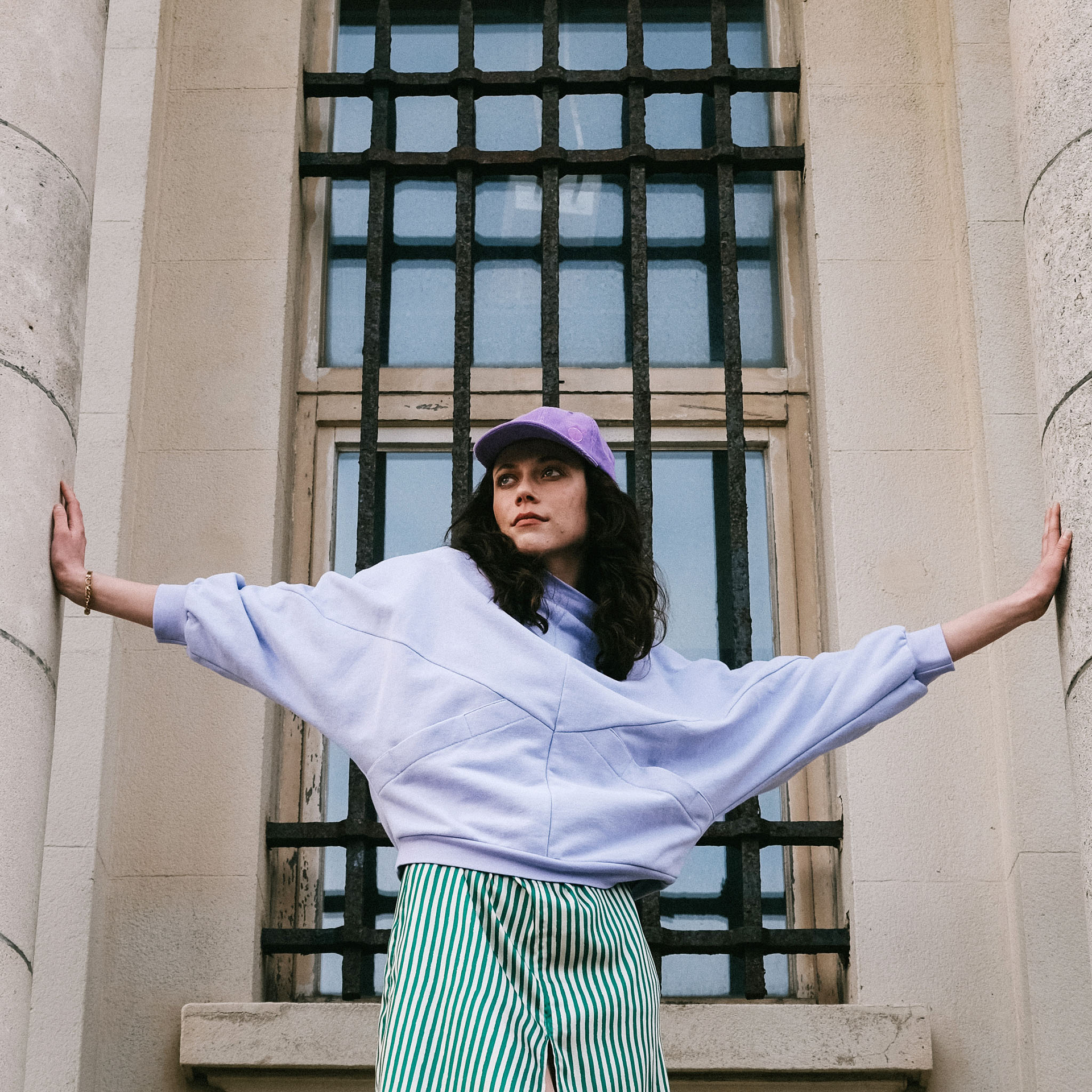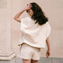 Rava heeft een losse, oversized pasvorm. De mouwen lopen smaller richting de polsen en zijn afgewerkt met een elastische tunnel. Door de elastische tunnel zit hij ook iets smaller bij de zoom. De mouwloze versie heeft een boxy snit met oversized armsgaten.