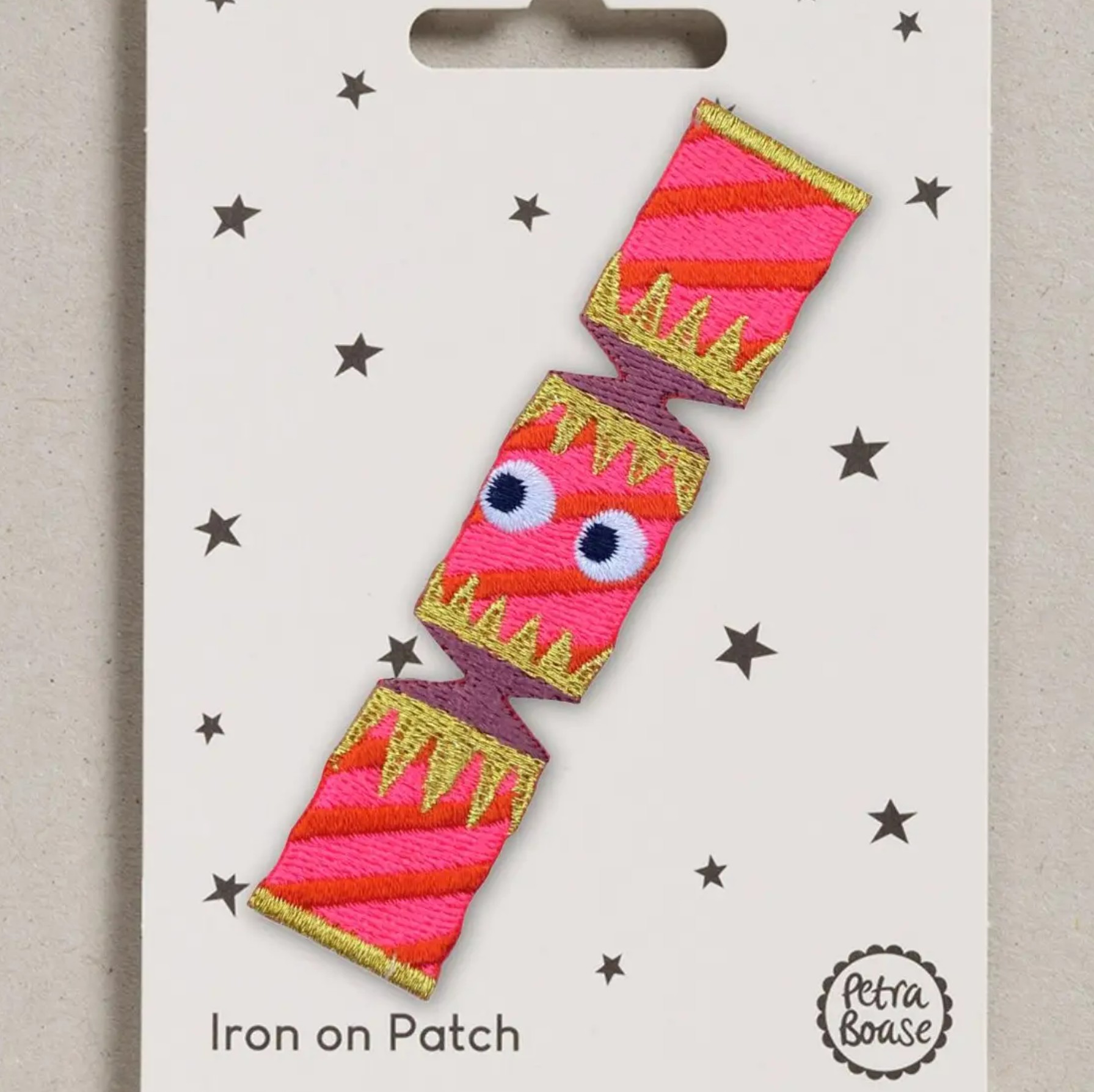 Petra Boase - Iron on Patch - Christmas Cracker Een klein bedrijf met ambacht en duurzaamheid inhet hart, Petra Boase heeft als doel om een beetje vreugde in het dagelijks leven te brengen. Dat kan je terugzien in haar kleurrijke patches! Een leuke en rijkelijk geborduurde kerstpatch. De patch heeft een opstrijkbare achterkant, zodat deze van de kaart kan worden verwijderd en rechtstreeks op de stof kan worden gestreken. Maak een trui voor het kerstfeest, naai aan de kerstkousen, versier de servetten voor het kerstdiner... de creatieve mogelijkheden zijn eindeloos om leuke kerstknutsels te maken.