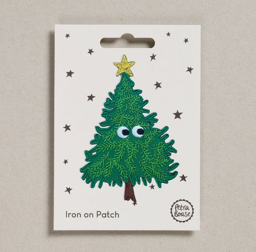 Petra Boase - Iron on Patch - Christmas Tree Een klein bedrijf met ambacht en duurzaamheid inhet hart, Petra Boase heeft als doel om een beetje vreugde in het dagelijks leven te brengen. Dat kan je terugzien in haar kleurrijke patches! Een rijkelijk geborduurde kerstboom met wiebeloogjes, met een strijkbare achterkant. De patch heeft glinsterende groene borduurdetails.