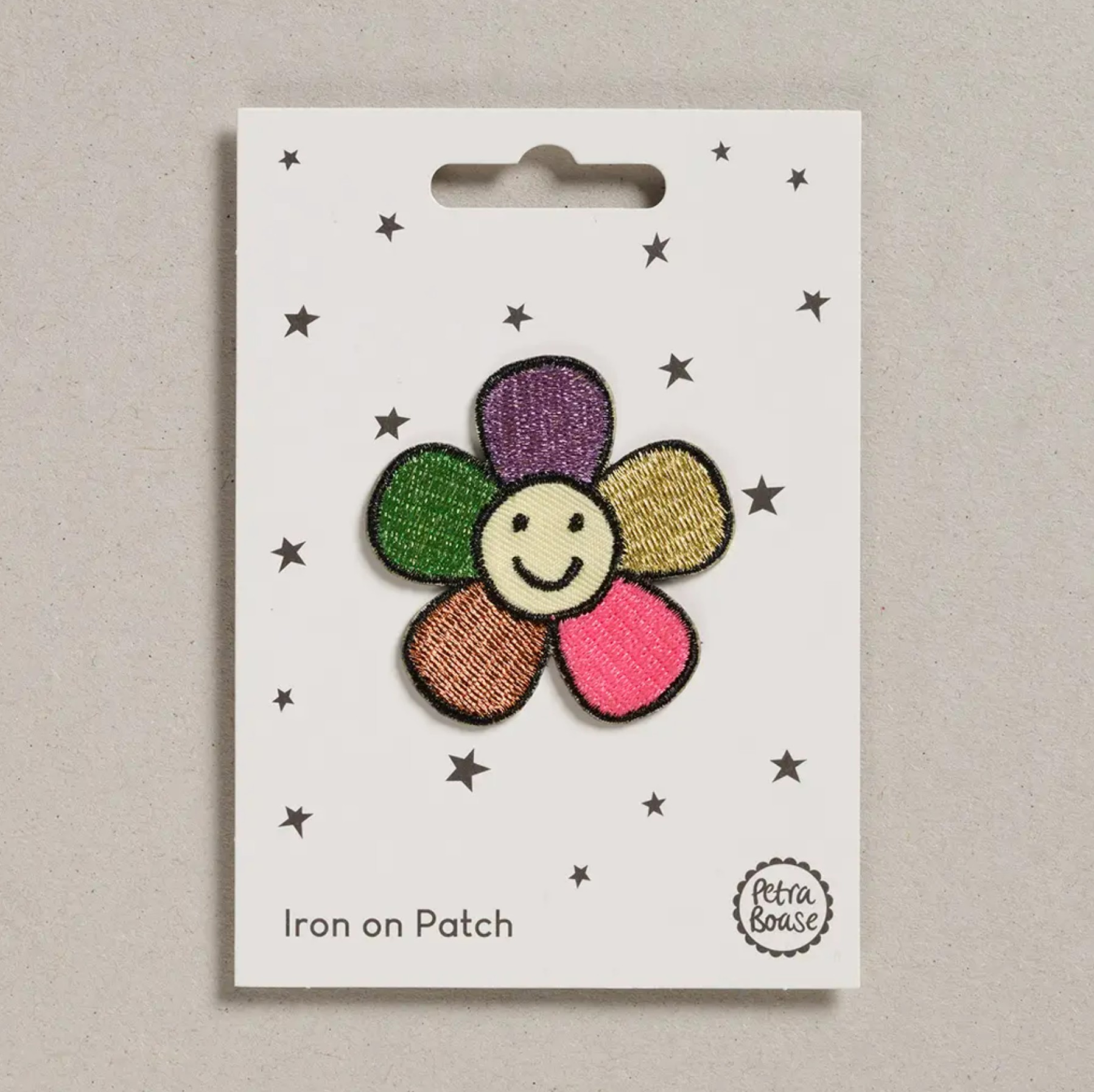 Petra Boase - Iron on Patch - Happy Flower Een klein bedrijf met ambacht en duurzaamheid inhet hart, Petra Boase heeft als doel om een beetje vreugde in het dagelijks leven te brengen. Dat kan je terugzien in haar kleurrijke patches! Een rijk geborduurde stoffen patch. De patch heeft een opstrijkbare achterkant zodat deze van de kaart kan worden verwijderd en recht op de stof kan worden gestreken.