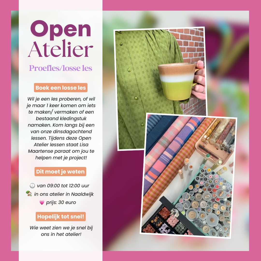 Proefles Naaien Wil je een les proberen, of wil je maar 1 keer komen om iets te maken/ vermaken of een bestaand kledingstuk namaken. Kom langs bij een van onze dinsdagochtend lessen. Tijdens deze Open Atelier lessen staat Lisa Maartense paraat om jou te helpen met je project! Adres: Grote Woerdlaan 22 2671CL Naaldwijk Bij annulering is er geen restitutie, wel gaan we op zoek naar vervanging en mocht dit nog lukken dan kunnen we een tegoedbon geven of de les verzetten.