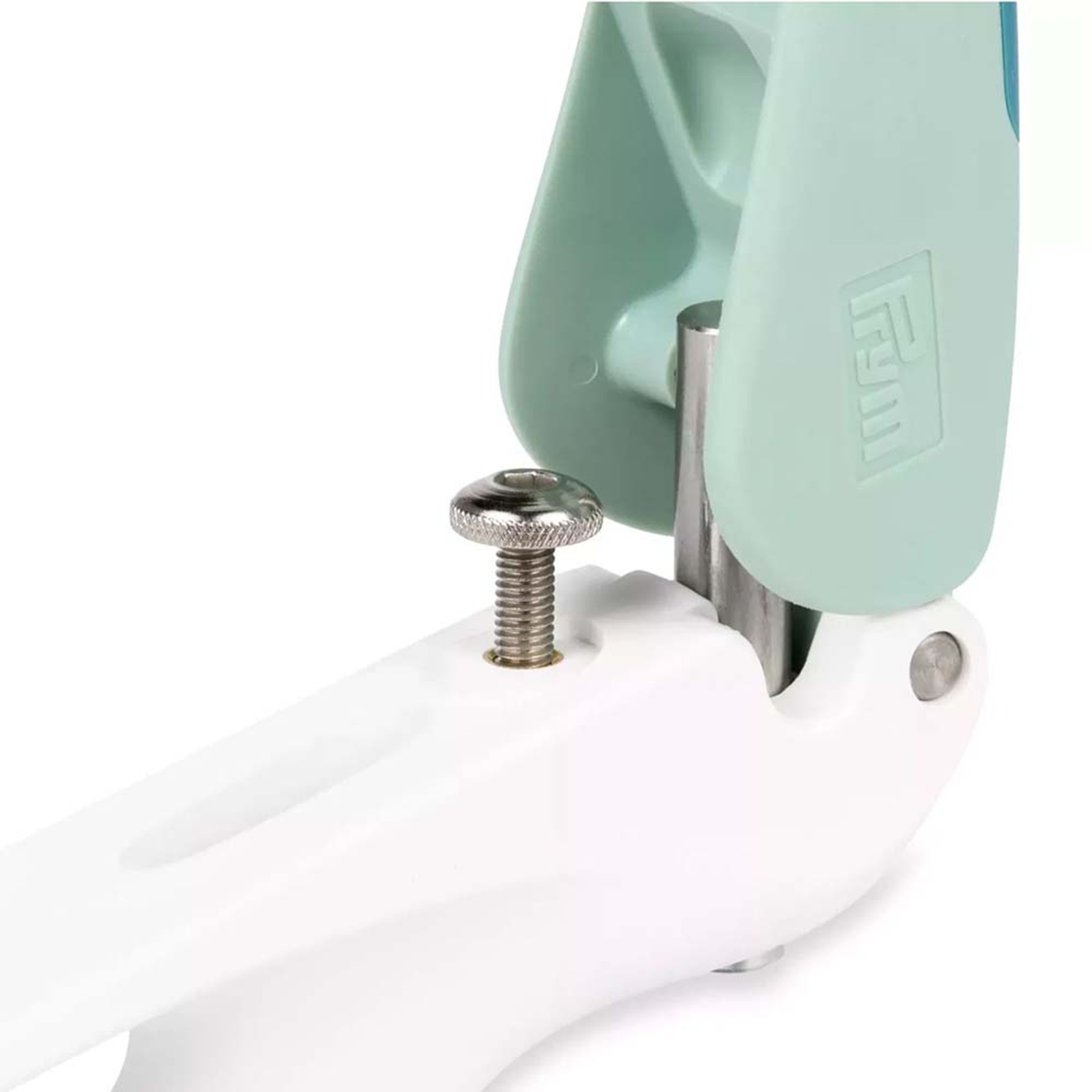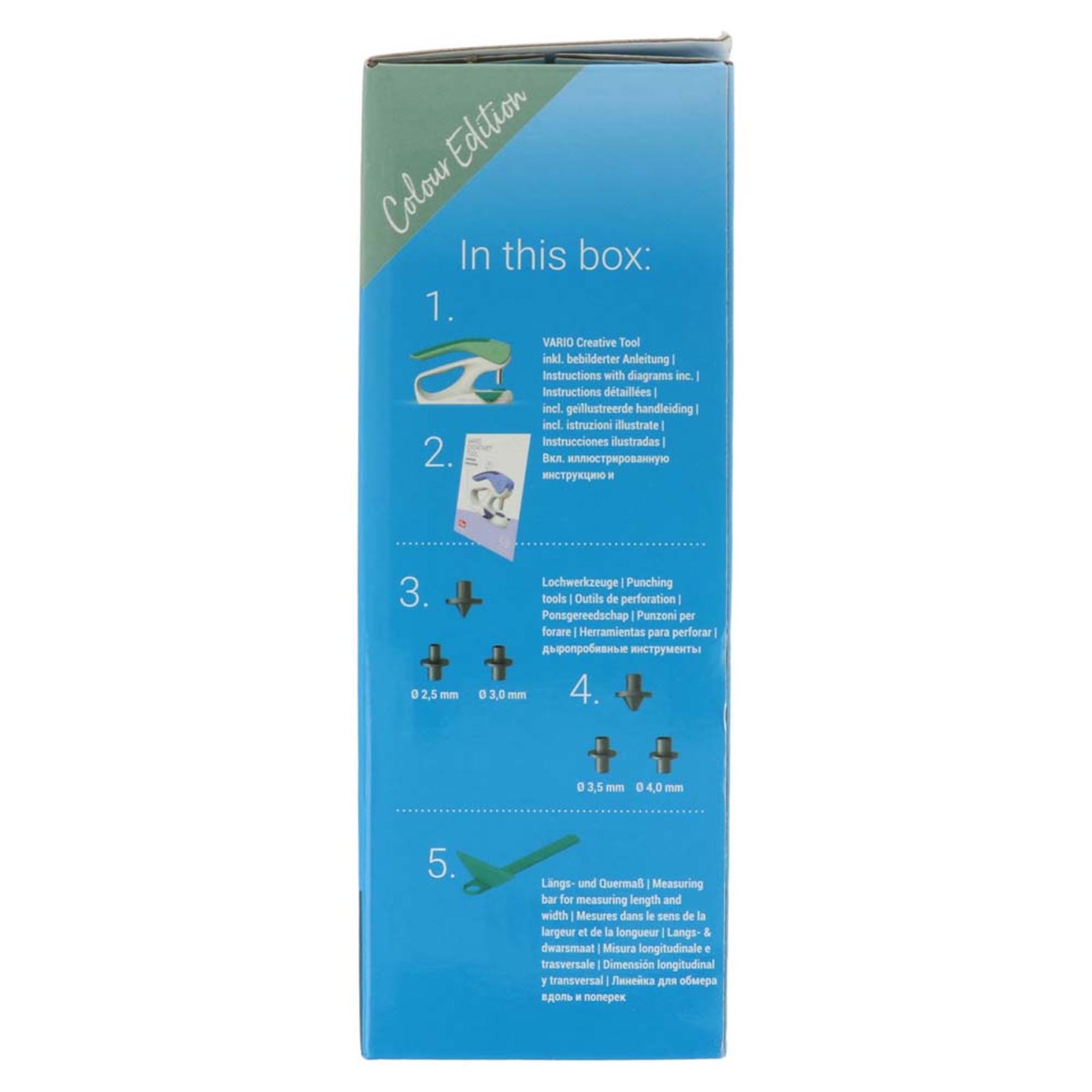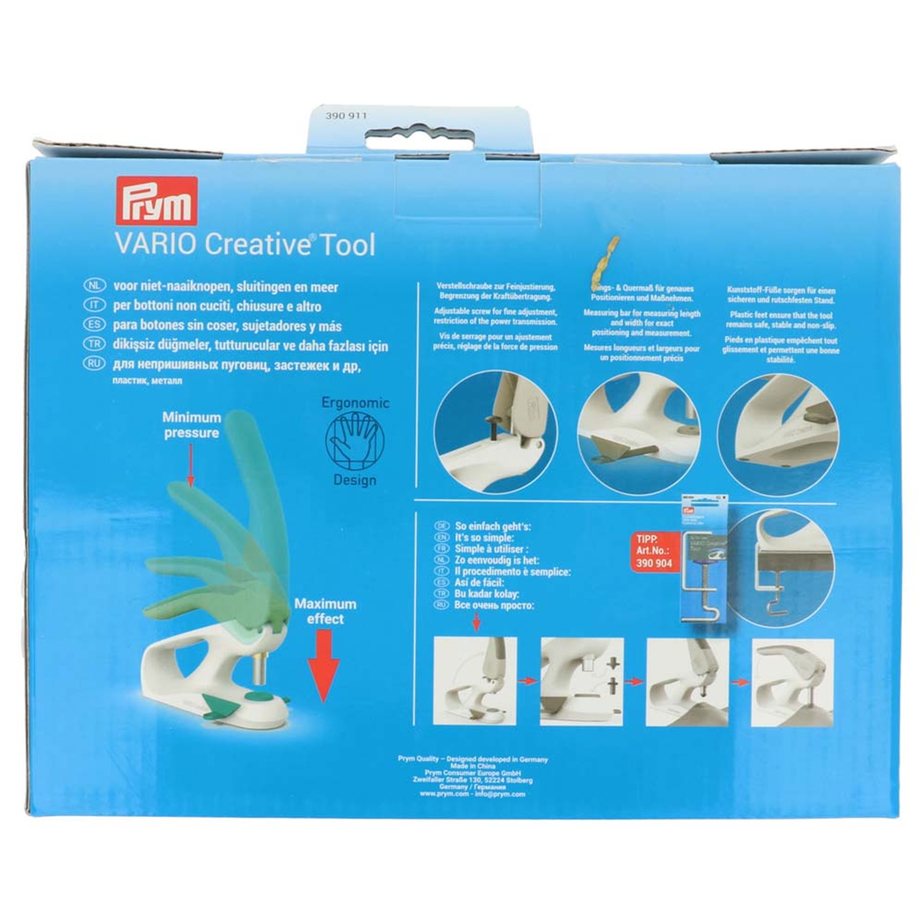 De multifunctionele Vario Creative Tool van Prym stelt je in staat om met één stuk gereedschap meerdere werkzaamheden uit te voeren. Het apparaat is namelijk geschikt voor zowel het maken van gaten als het bevestigen van drukknopen, ringen en siernieten in stof en leer. Het ergonomische handvat geeft een goede grip en door het slimme ontwerp heb je minder duwkracht nodig. Zelfs bij het bewerken van dikkere materialen zullen je handen en armen niet moe worden en het resultaat is altijd goed. Het wisselen tussen de verschillende functies gaat moeiteloos: bevestig simpelweg de benodigde hulpstukken voor de specifieke functie en je kunt weer verder. De Vario Creative Tool heeft een schroef waarmee je het apparaat precies kan afstellen op de gewenste stofdikte en de plastic anti slip voetjes zorgen ervoor dat de Tool stevig blijft staan. Voor het perfect positioneren van een gat, drukknoop, ring of sierniet heeft de Vario Creative Tool bovendien een geïntegreerde liniaal. Dit zeer innovatieve stuk gereedschap heeft een minimalistische uitstraling, een ergonomisch ontwerp en is gemaakt van materialen van hoge kwaliteit.
