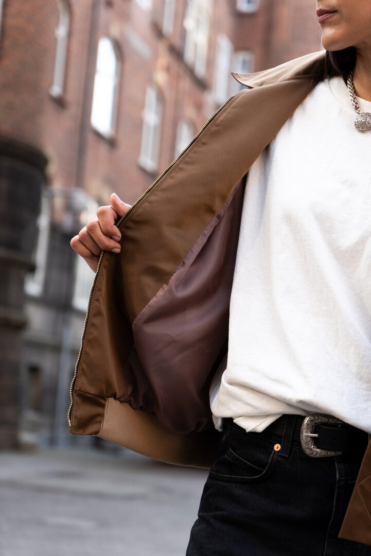 De Puff and Pencil Bomber Jacket is een loszittend, volledig gevoerd jack met klassieke kraag en ribboorden bij polsen en heupen, dat een casual maar nette bomberstijl biedt.