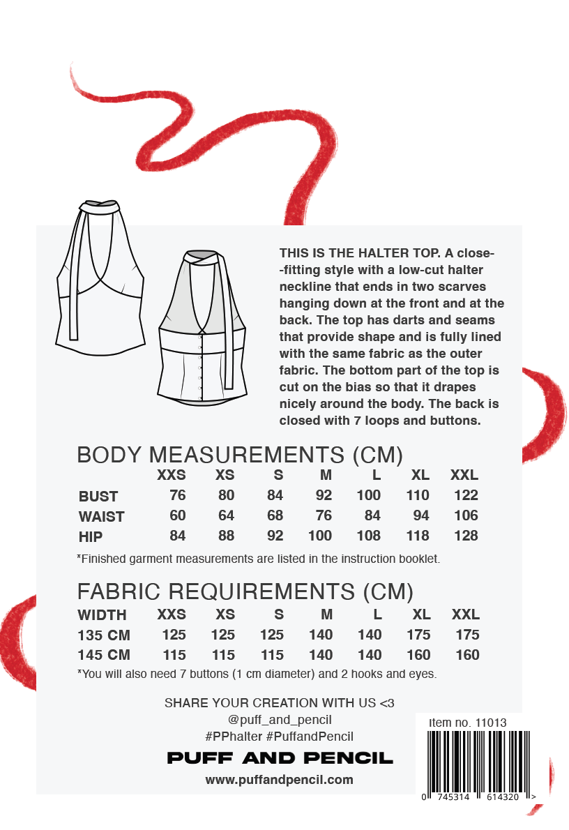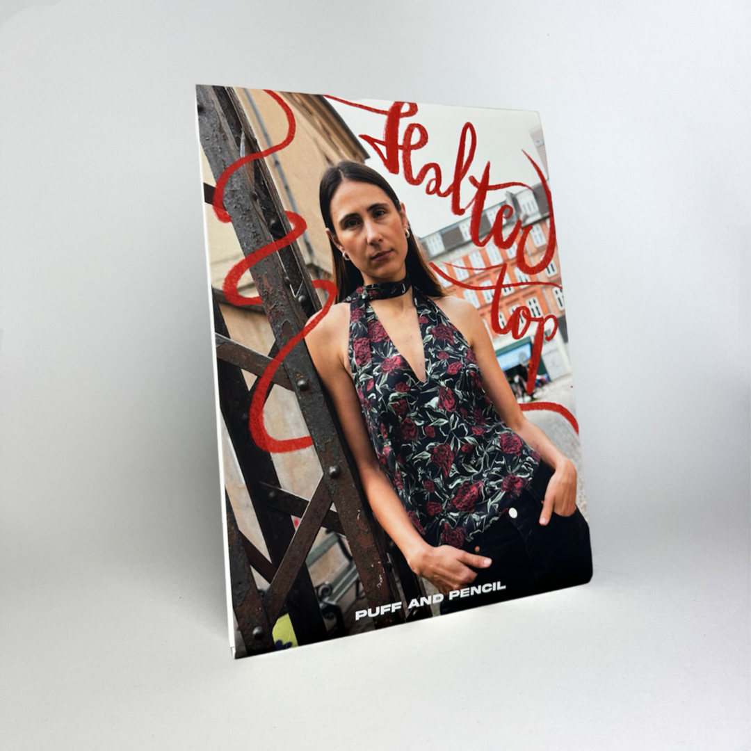 This is the printed pattern for the HALTER Top. The HALTER Top is a figure-hugging style with a deep halter neckline, finished with two airy scarves. The HALTER Top is a close-fitting style with a low-cut halter neckline that ends in two scarves hanging down at the front and back. Additionally, there is a seam under the bust.