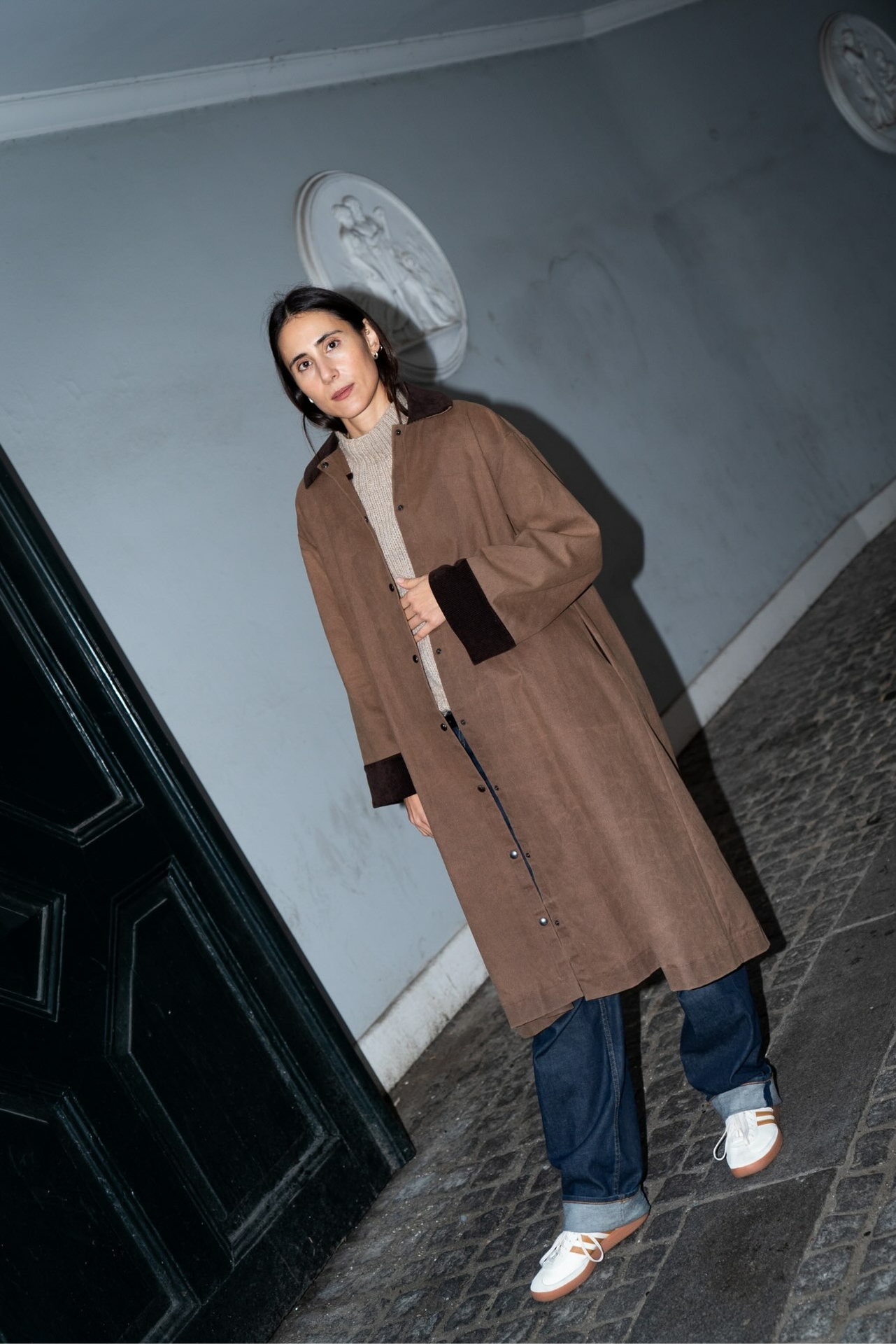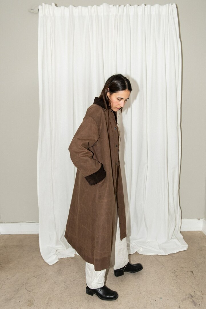 oilskin works well for this jacket. In addition, we recommend using a thinner quality for the pockets e.g. cotton canvas in a color that matches the outer fabric.