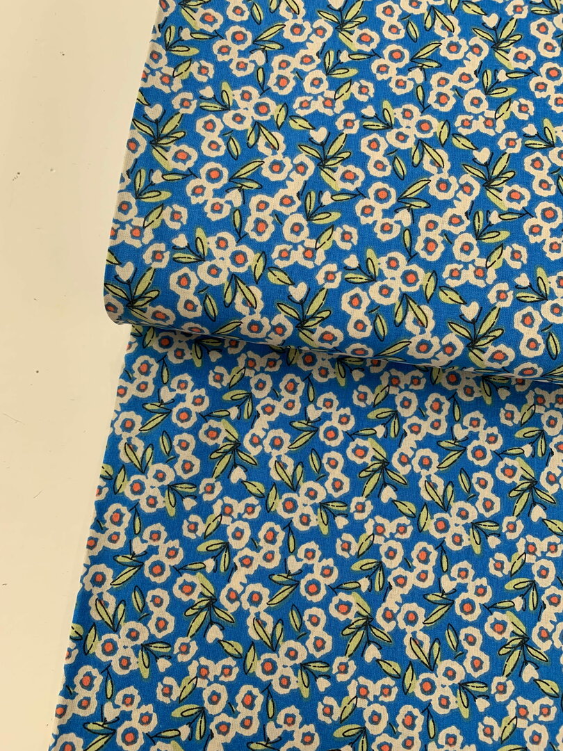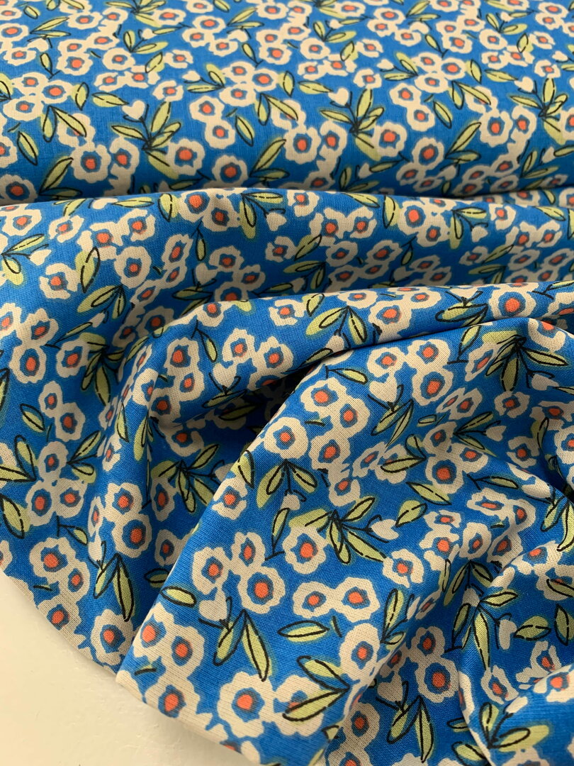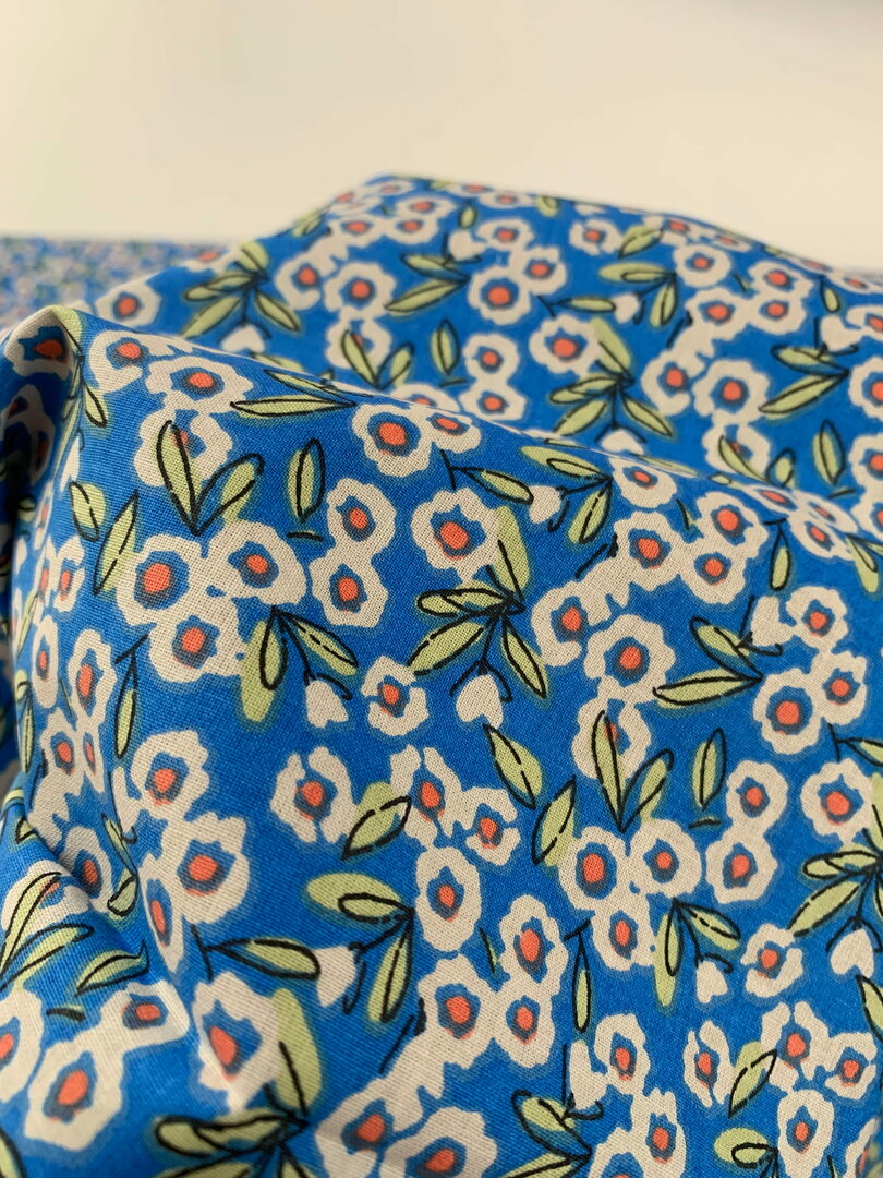 Deze OEKO-TEX gecertificeerde katoen heeft fijne blauwe bloemetjes met een oranje hartje.