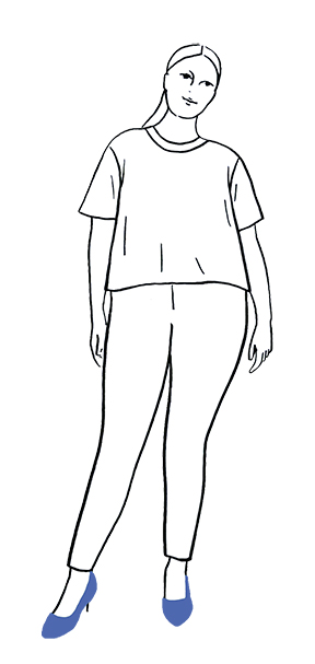 Choose medium-weight knit and stretchy fabrics such as jerseys, sweater fabrics, wool knits, and Tencel knits. The sample top is made from “Organic Sweat” (95% organic cotton, 5% elastane, 7.96 oz/210 gsm) in the colour creme, and the tunic sample is made from “LeatherGradient Space” (95% organic cotton, 5% elastane, 7.96 oz/210 gsm), both fabrics by Astrokatze. The dress is made from merino wool (100% mulesingfree merino wool, 7.37 oz/250 gsm) by Kimmi.
