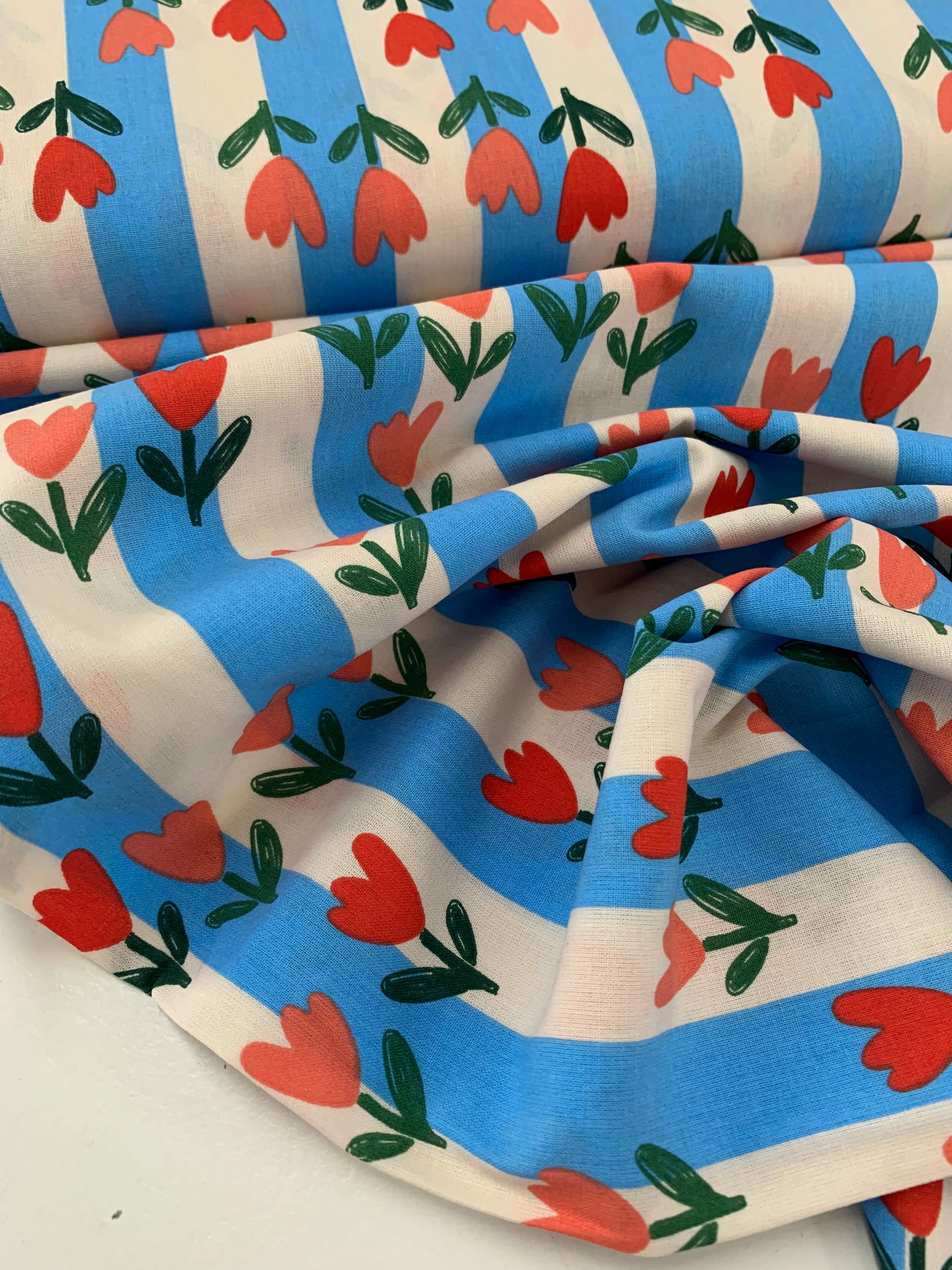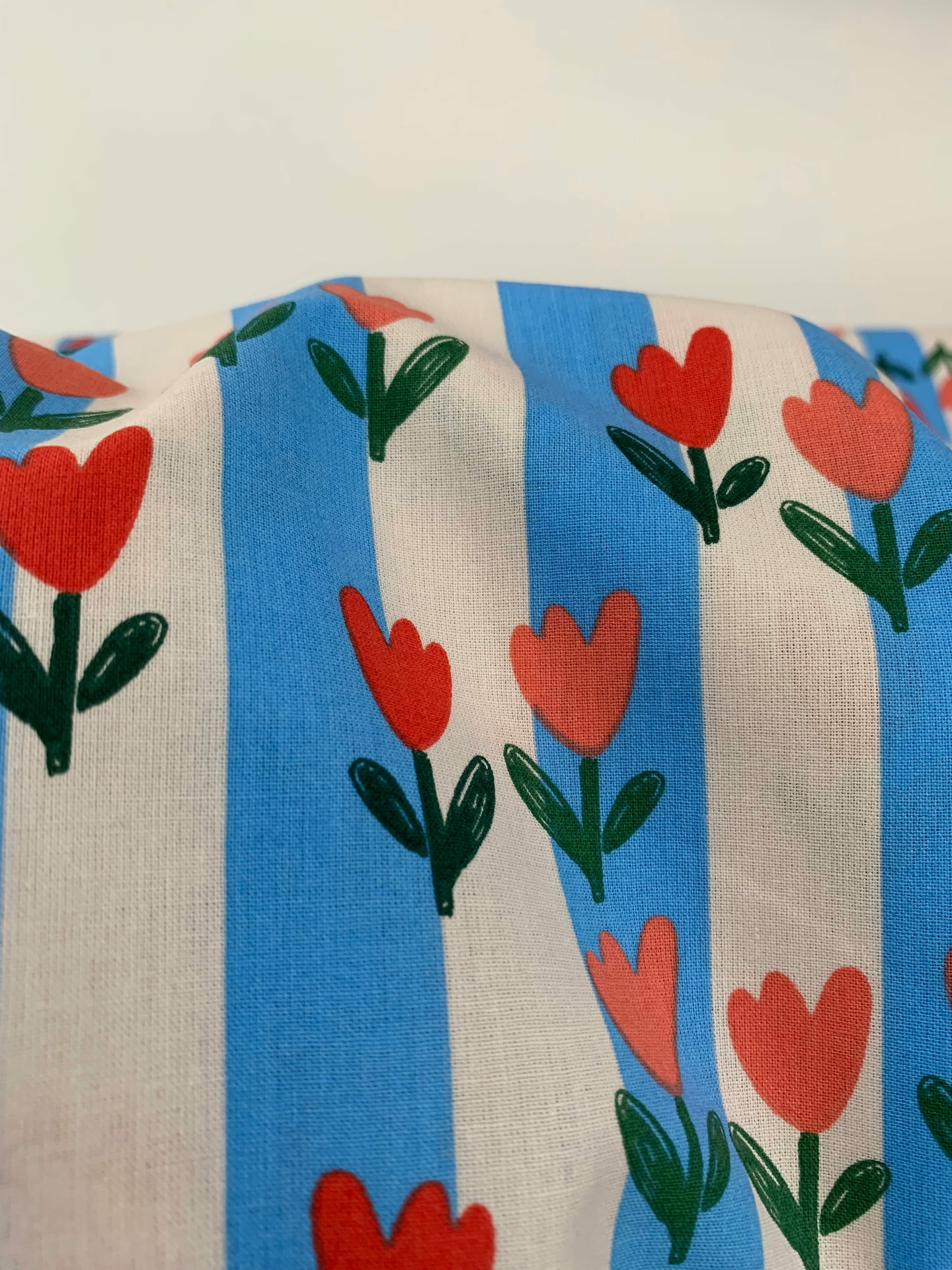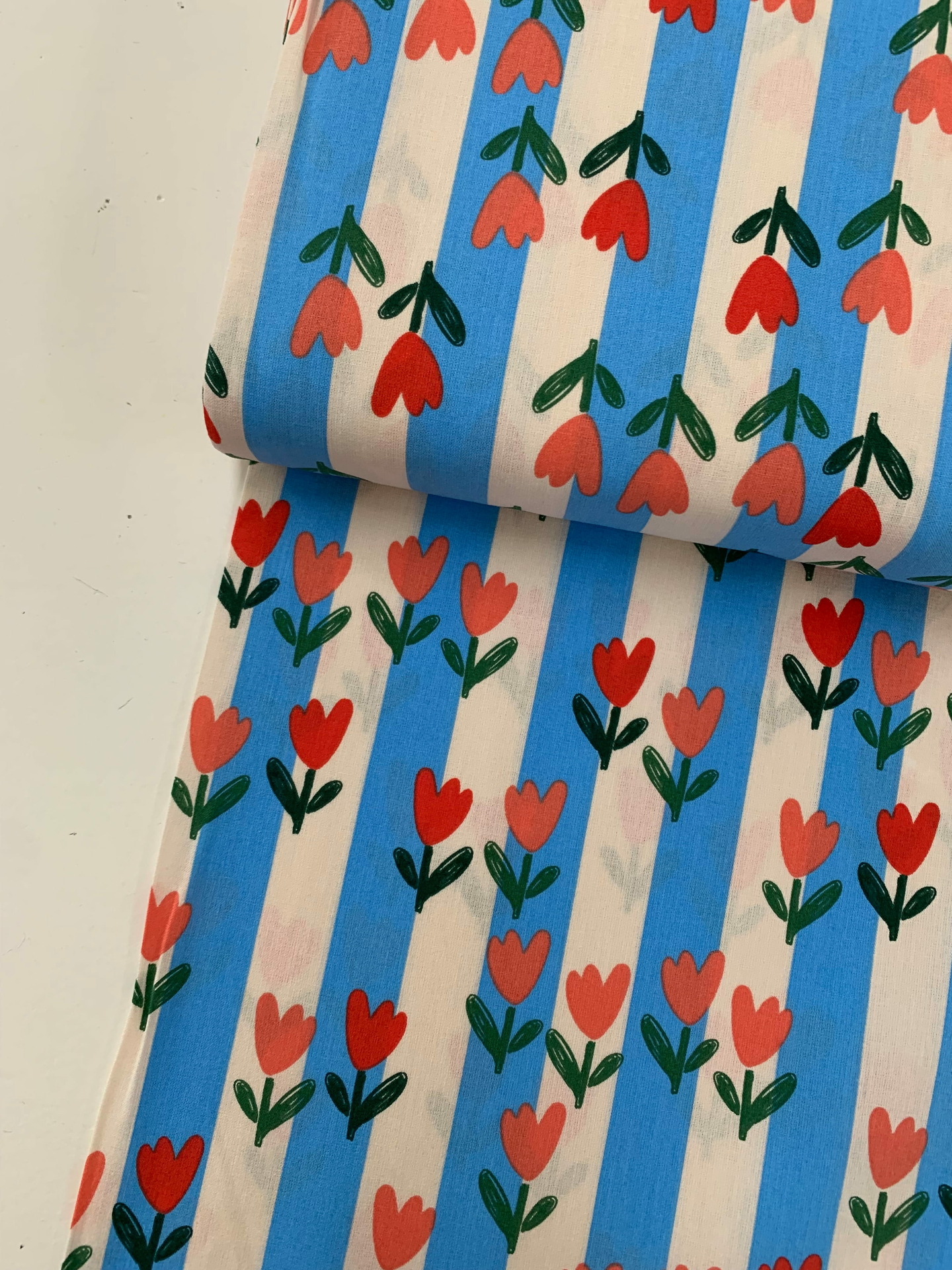 Een frisse blauw/ecru-kleurige streep met vrolijke tulpjes