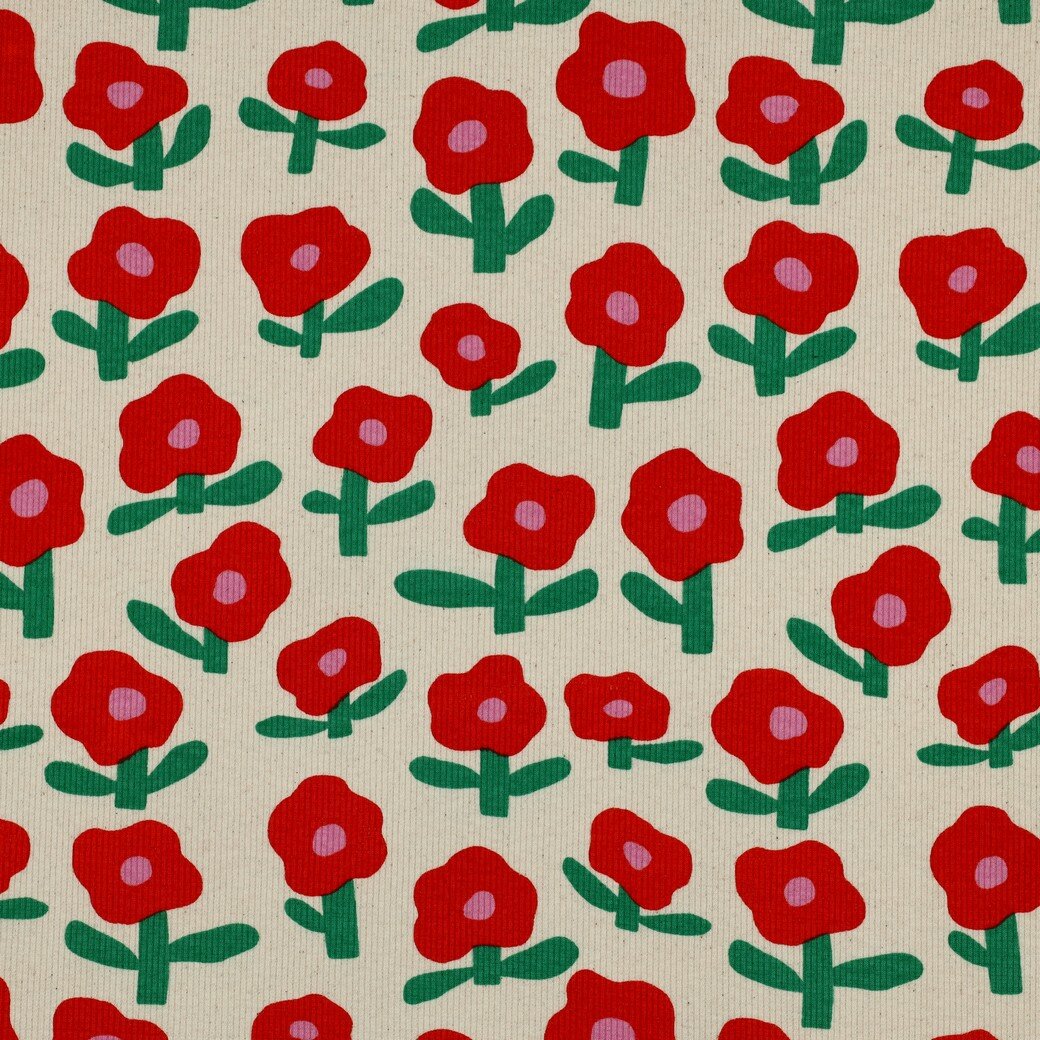 Soepele BIO ribbed jersey met bloemetjes op naturel ondergrond, geschikt voor kinderkleding, shirts, tops..