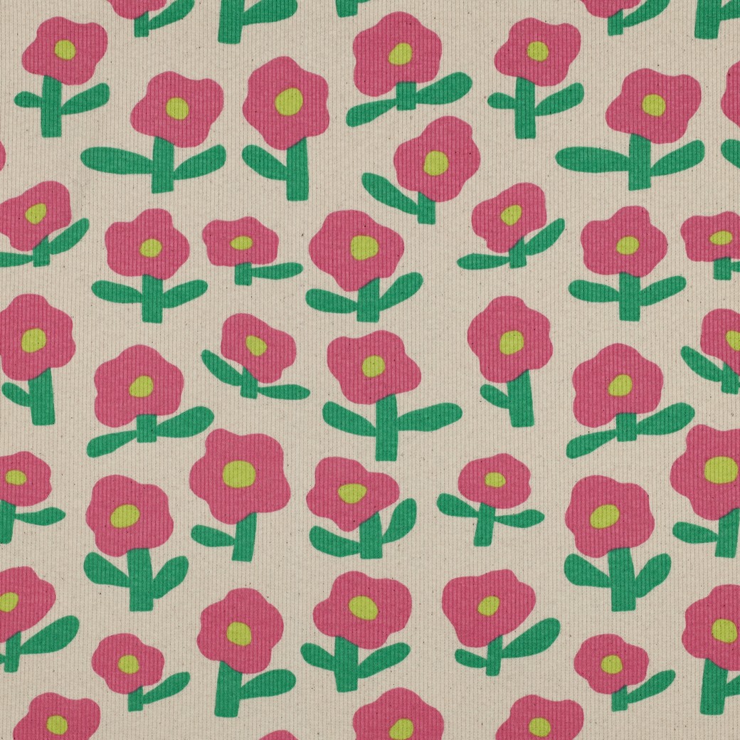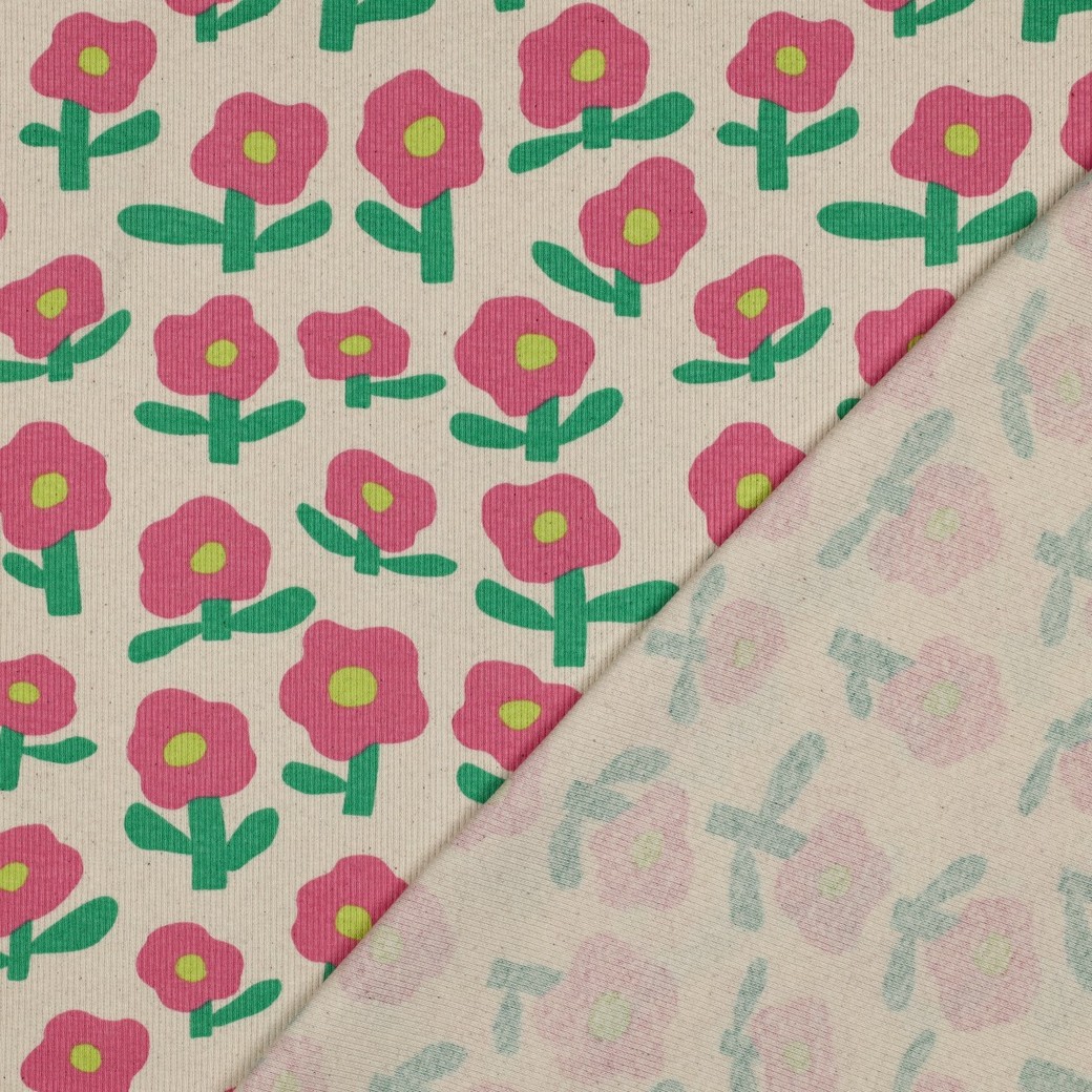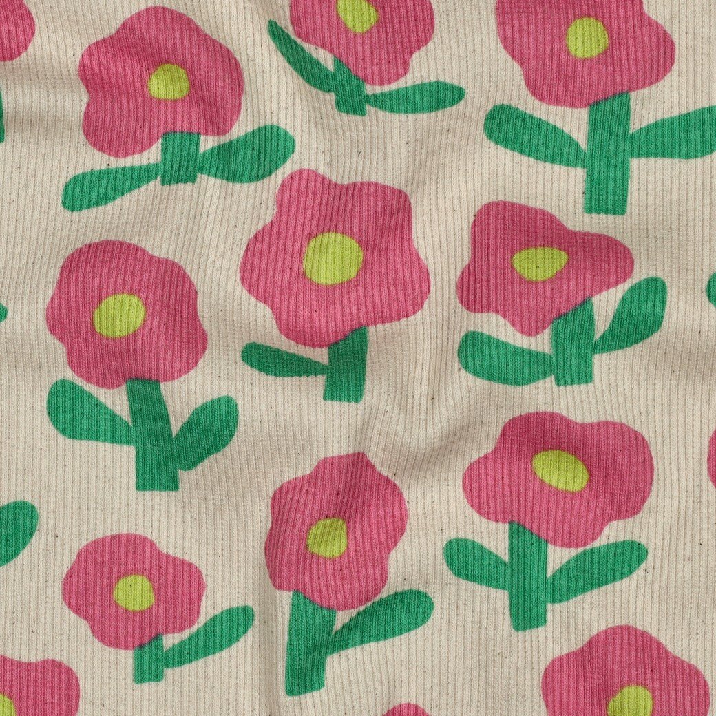 Soepele BIO ribbed jersey met bloemetjes op naturel ondergrond, geschikt voor kinderkleding, shirts, tops..