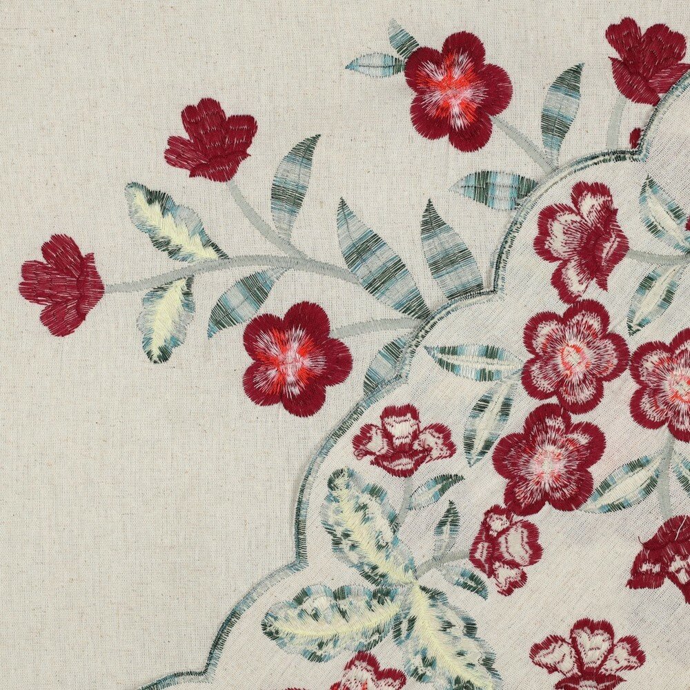Deze mooie geborduurde linnen viscose is leuk voor het maken van blouses, tops, rokken en jurken. Maar ook voor deco zoals het kleed op de foto.
