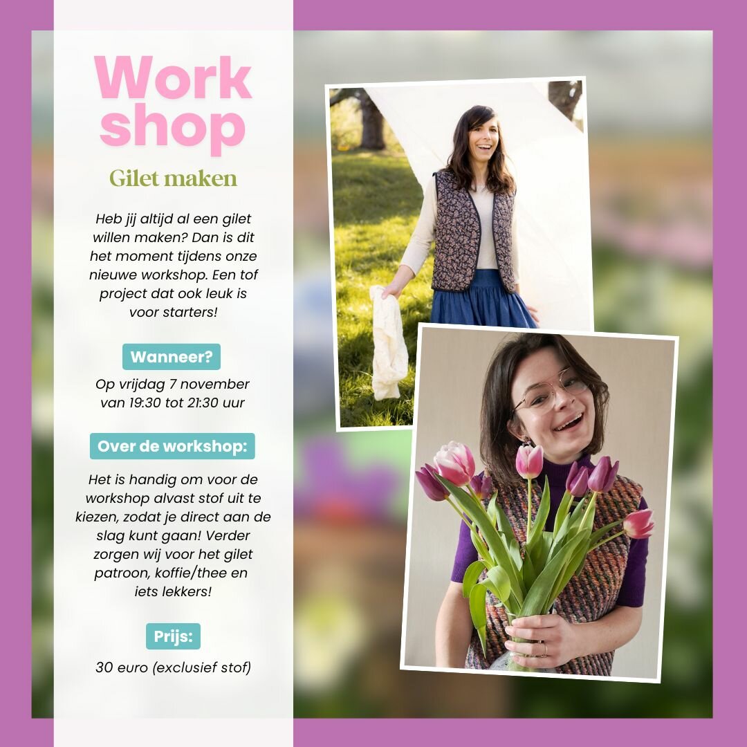Workshop Gilet Ook leuk voor startende naaisters 18.30-21.30 (uitloop tot 22 uur mogelijk) Wil je graag een keer een gilet maken dan is dit zeker weten een leuke workshop voor jou! Lisa Maartense is onze workshop expert. Zij is coupeuse en heeft jarenlange ervaring op het gebied van naaien en werkt nu veel in opdracht voor theaters(kostuums). In deze workshop gaan we een Gilet maken. Je kunt kiezen uit maat XS t/m XL. Wij zorgen voor een kant en klaar patroon. Deze workshop is voor iedereen die al kan naaien, of die net is gestart of wil starten met naaien. Voorbereidingen: Zorg ervoor dat je een stof hebt uitgekozen. Je kunt je eigen stof meenemen of een stof bij Ansje aanschaffen met 10% korting. Je hebt ongeveer 60/70cm buiten stof en binnenstof nodig. Het gilet is gevoerd/dubbelzijdig. Heb je hulp nodig met het knippen van het patroon of andere vragen vooraf kan je altijd contact opnemen met ons: info@ansje.eu Je kunt gebruik maken van een speciale ansje kortingsode voor de workshop waarbij je 10% korting krijgt op stoffen Maar als je zelf al een stof hebt liggen mag je deze uiteraard gebruiken. Wij adviseren teddy, katoen, canvas, twill etc. We helpen je graag met de keuze :) We verzorgen die avond voor koffie/thee/water en wat lekkers. Bij annulering is er geen restitutie, wel gaan we op zoek naar vervanging en mocht dit nog lukken dan kunnen we een tegoedbon geven.